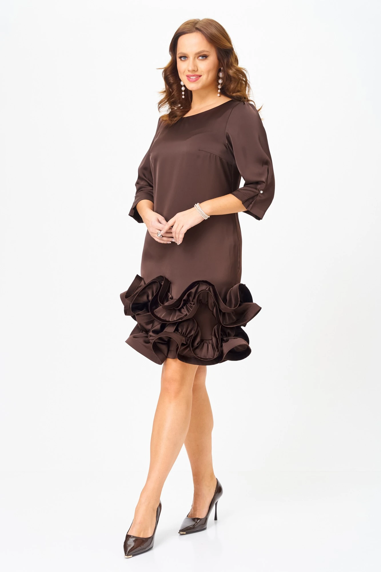 Нарядное платье полуприлегающего силуэта, выполненное из струящегося шелка «Армани» (немного тянется), без подкладки. По переду нагрудные вытачки. По спинке средний шов с застежкой на навесную петлю-пуговицу. Горловина округлой формы. Рукава втачные одношовные со сборкой по окату, встречной складкой и отделочной пуговицей по низу. Низ платья оформлен двумя присборенными воланами, края которых обработаны специальной тесьмой для придания формы изгибов воланам ( тесьма мягкая, подвижная).