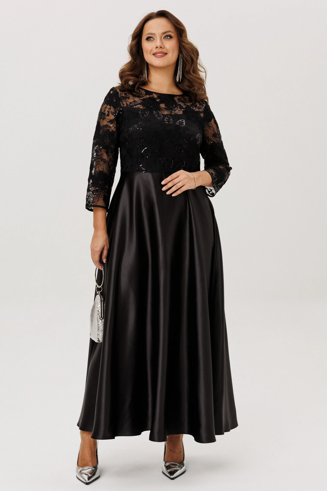 Нарядное женское платье отрезное по линии талии. Верхняя часть выполнена из гипюра с вышивкой и пайетками (не тянется), нижняя часть из плательного шелка «Армани» (немного тянется). По лифу переда – талиевые вытачки. По лифу спинки средний шов и потайная застежка-молния. По лифу переда и спинки – подкладка (немного тянется). Горловина округлой формы, обработана окантовкой. Рукава втачные, одношовные, по низу обработаны окантовкой. Нижняя часть платья – «полусолнце» по спинке со средним швом.