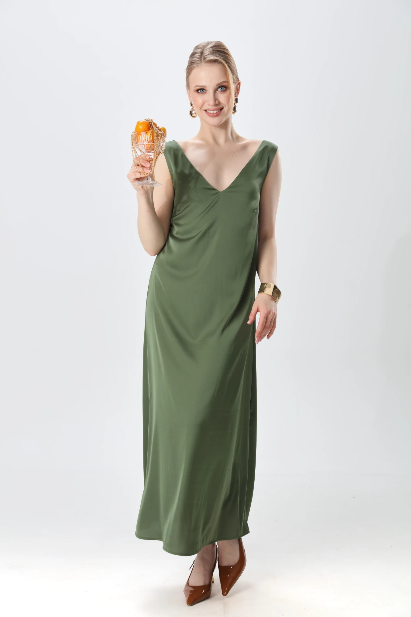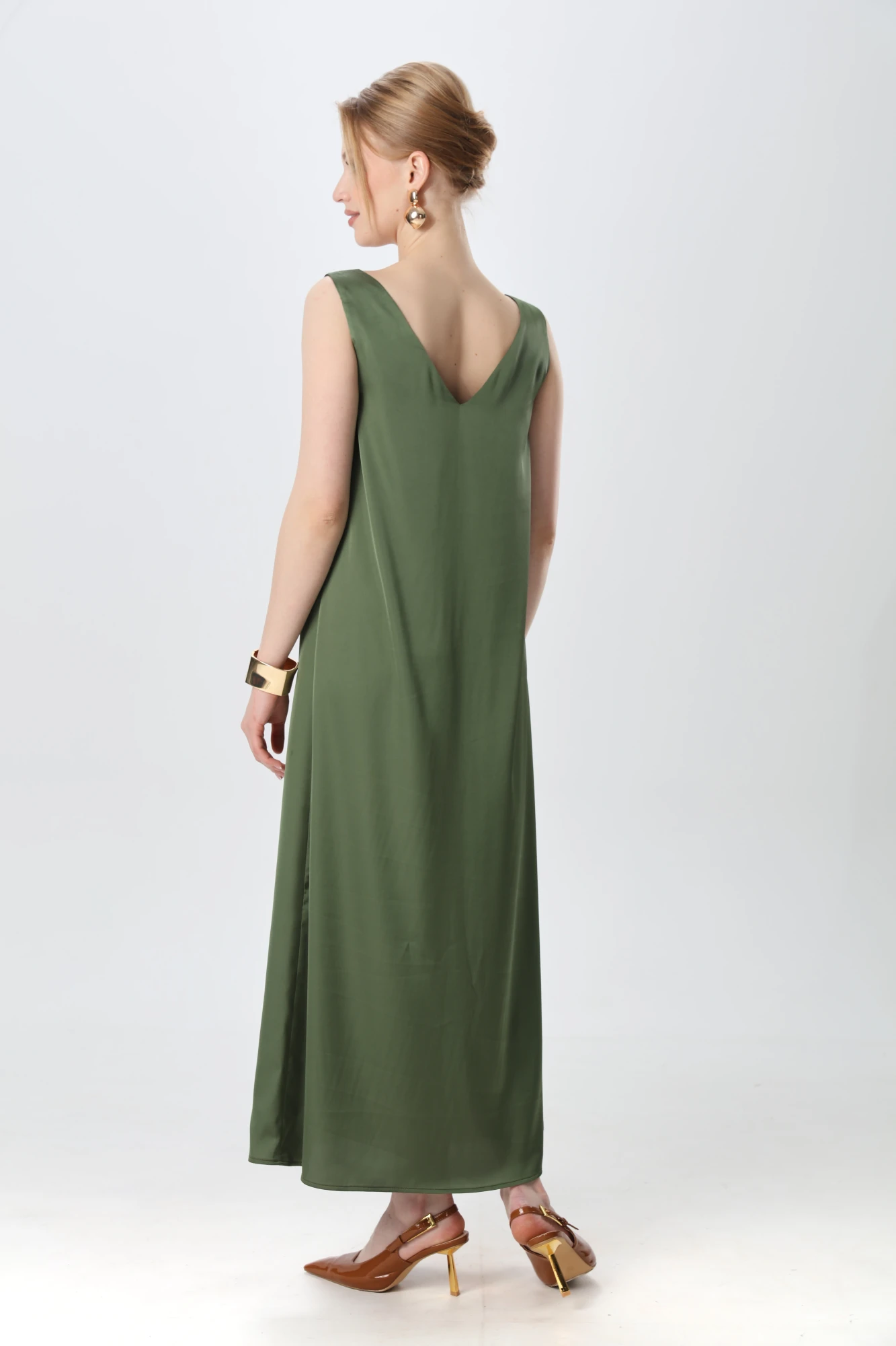 Платье прямого силуэта, с небольшим расширением к низу, длиной макси. Перед с нагрудной вытачкой из бокового шва. Вырез горловины переда и спинки имеют V-образную форму.