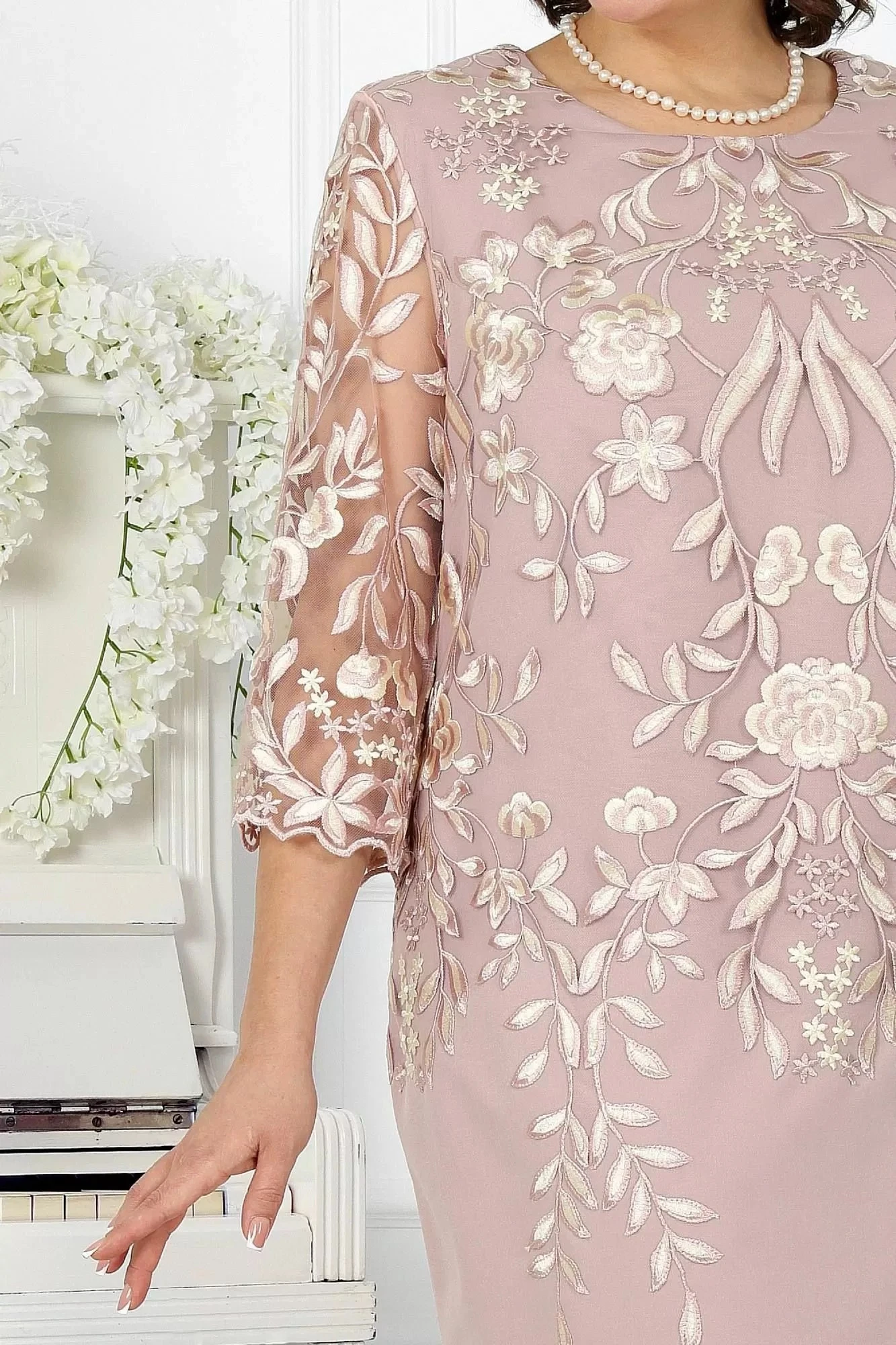 Платье женское полуприлегающего силуэта, зауженное к низу, из костюмно-плательной ткани в сочетании с гипюром. Длина по среднему шву спинки р 50-52 - 101,5 см, р 56-66 – 103,5 см. Перед и спинка двухслойные от плечевого шва до нижней линии бедер, с настрочными декоративными веточками, направленными к низу изделия. Верхний слой выполнен из гипюра. Перед с нагрудными вытачками, идущими из пройм. Спинка, с талиевыми вытачками в нижнем слое, со средним швом, в нижней части которого расположена шлица. В левом боковом шве обработана застёжка на потайную тесьму - "молнию". Горловина переда и спинки округлая, по переду углубленная. Рукава втачные, одношовные, выполнены из гипюра. Низ рукавов оформлен фестонами. Длина рукава 44 см. Платье с плечевыми накладками.