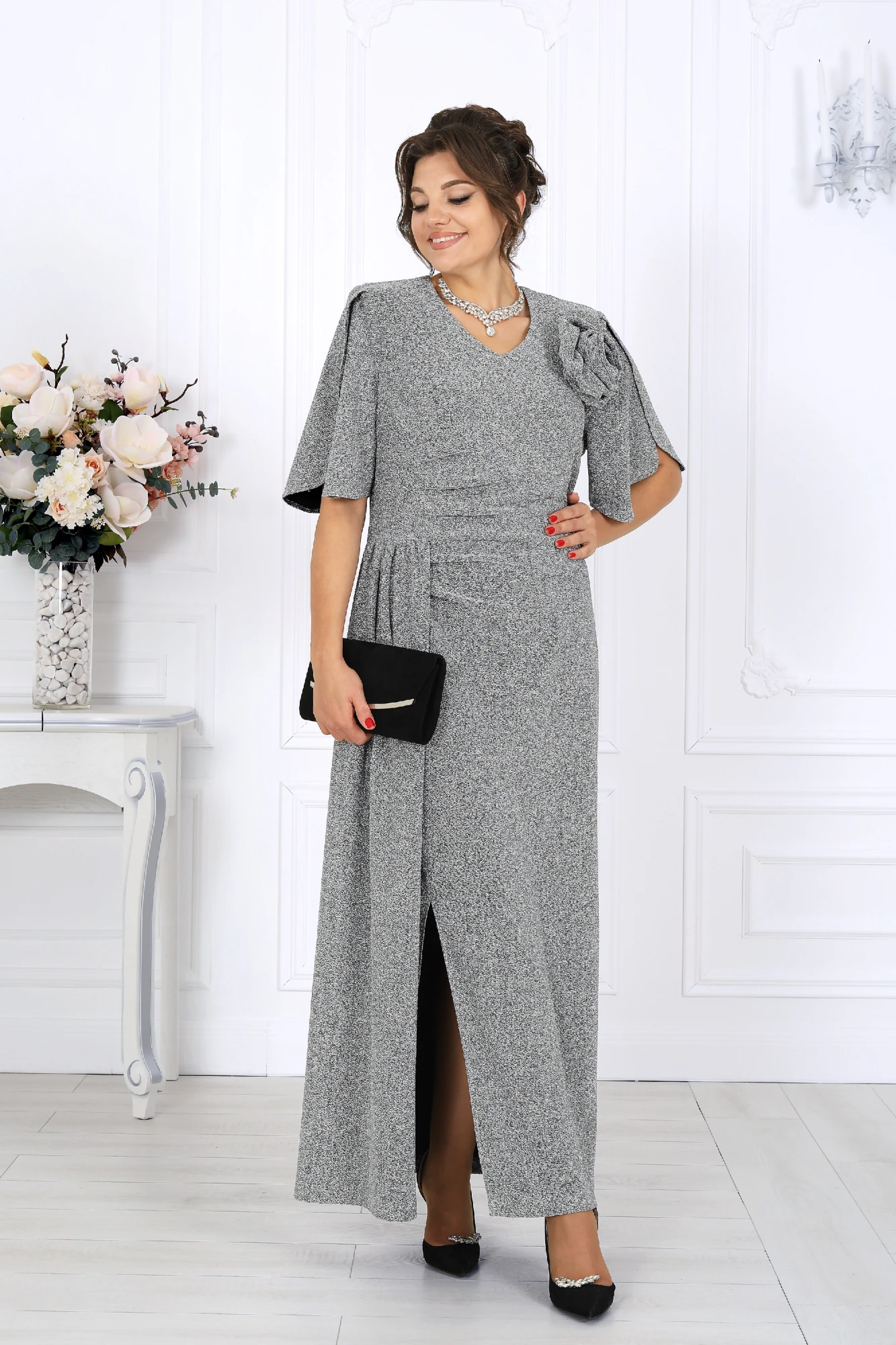 Платье женское полуприлегающего силуэта, выполнено из трикотажного полотна с фактурной лицевой стороной «люрекс». Модель на трикотажной подкладке, с плечевыми накладками. В левом боковом шве обработана застежка на потайную тесьму-«молнию» (35 см). Перед платья с горизонтальным подрезом по линии талии и отлетной деталью в шве подреза. В правой части переда обработан рельеф с разрезом в нижней части. Вдоль рельефного шва заложены односторонние складки, направленные к центру переда. Спинка с талиевыми вытачками. Горловина спинки округлая, по переду V-образная, углубленная. Рукав короткий, втачной, формы «крылышко на запах», со скругленными краями. Платье дополнено съемным «цветком» из основного полотна. Длина платья - 136 см; длина рукава - 31 см.