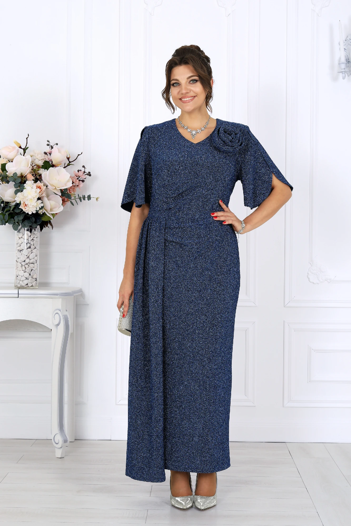 Платье, которое само по себе становится событием. Роскошное вечернее платье из мерцающего трикотажа с нитью люрекс создано, чтобы подчеркнуть женственность и элегантность в каждом движении. Оно притягивает взгляд, играя бликами при любом освещении — будь то мягкий свет ресторанных ламп или огни праздничного зала. Это тот редкий случай, когда комфорт и эффектность соединяются в идеальном балансе: платье выглядит торжественно, но остаётся удобным даже во время самого долгого вечера.