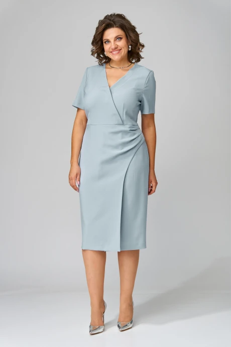Платье полуприлегающего силуэта, втачного покроя. Платье по переду ассиметричное с отрезной линией по талии. В верхней части переда имитация застежки на запах с V-образным вырезом, в нижней части переда так же «запах» со складками и закругленным подрезом, переходящим в шлицу. Рукава одношовные, короткие. Спинка со средним швом и талиевыми вытачками. В среднем шве расположена застежка на потайную молнию.