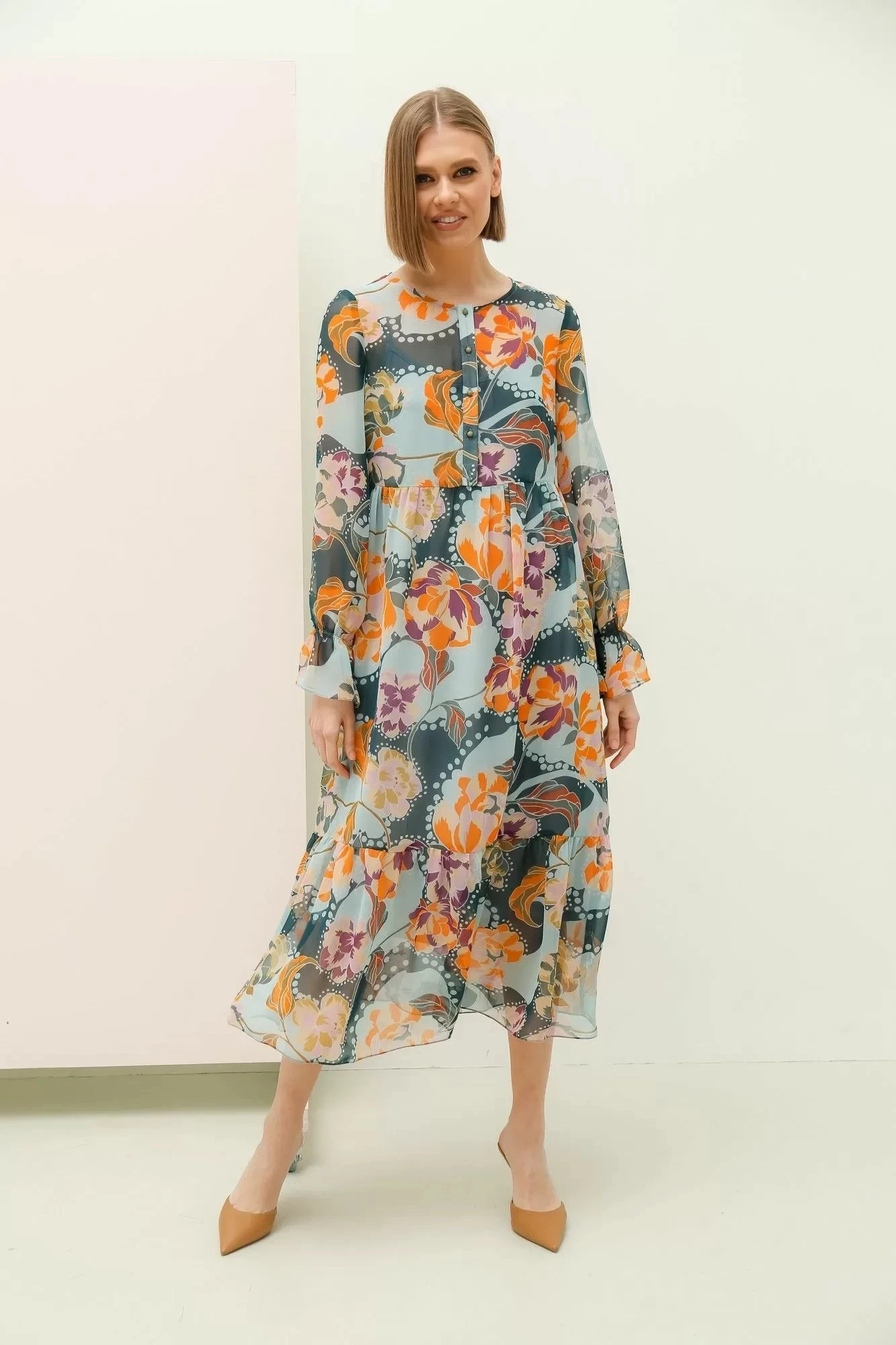 Платье состоит из верхнего платья из фатина,невероятно легкого воздушного, и нижнего платья-комбинации. Платье отрезное по груди,свободного силуэта.