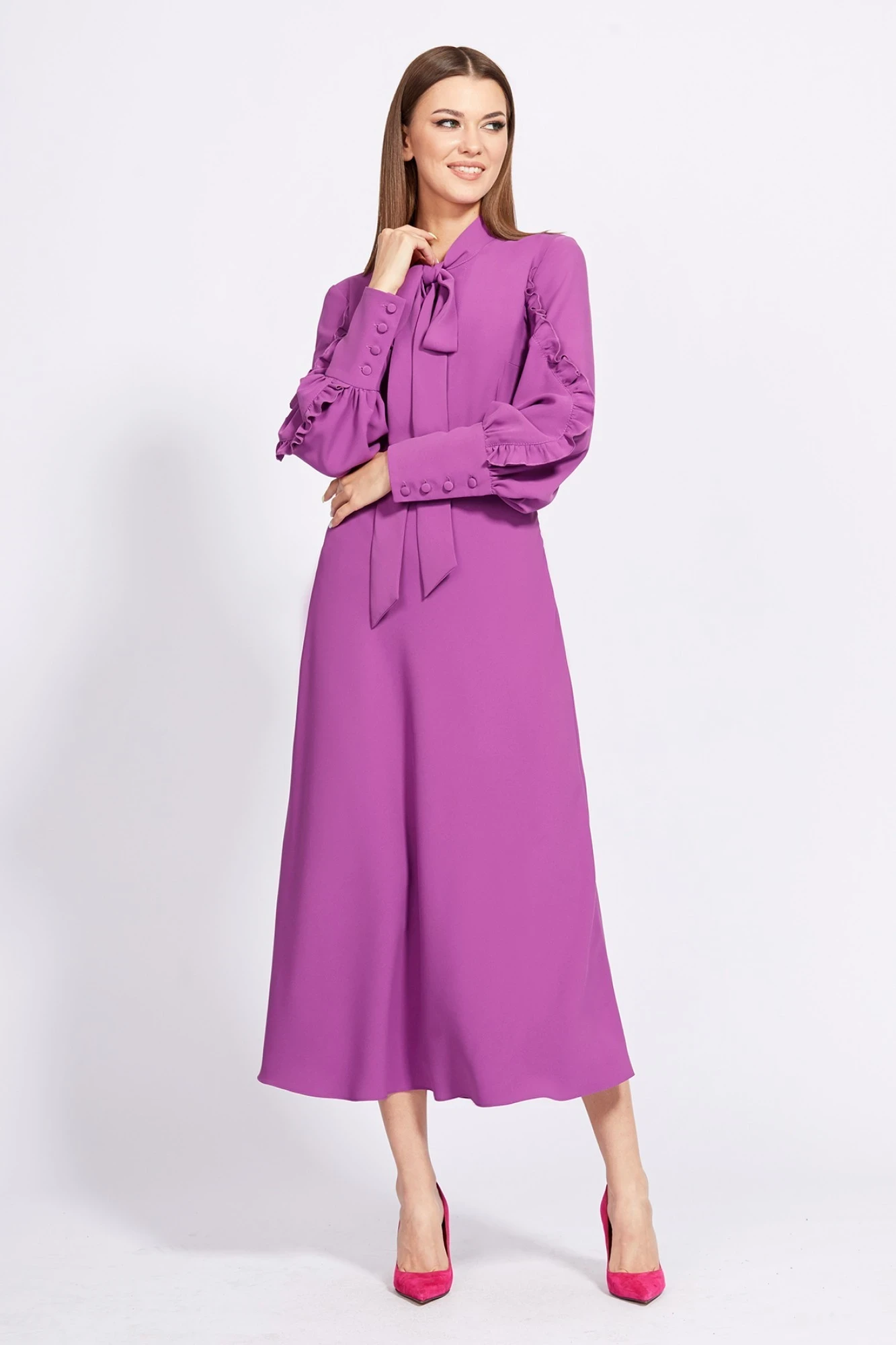 Платье выполнено из плательной ткани. Платье Х-образного силуэта, длиной миди. Застежка центральная на потайную планку. Воротник-стойка, переходящий в бант. Рукав втачной, двухшовный, со сборкой по низу. Низ рукава на манжете, застегивающейся на обтяжные пуговицы. Верхний шов декорирован рюшем. Юбка выкроена по косой и расширена к низу. В левом боковом шве застежка на потайную молнию.