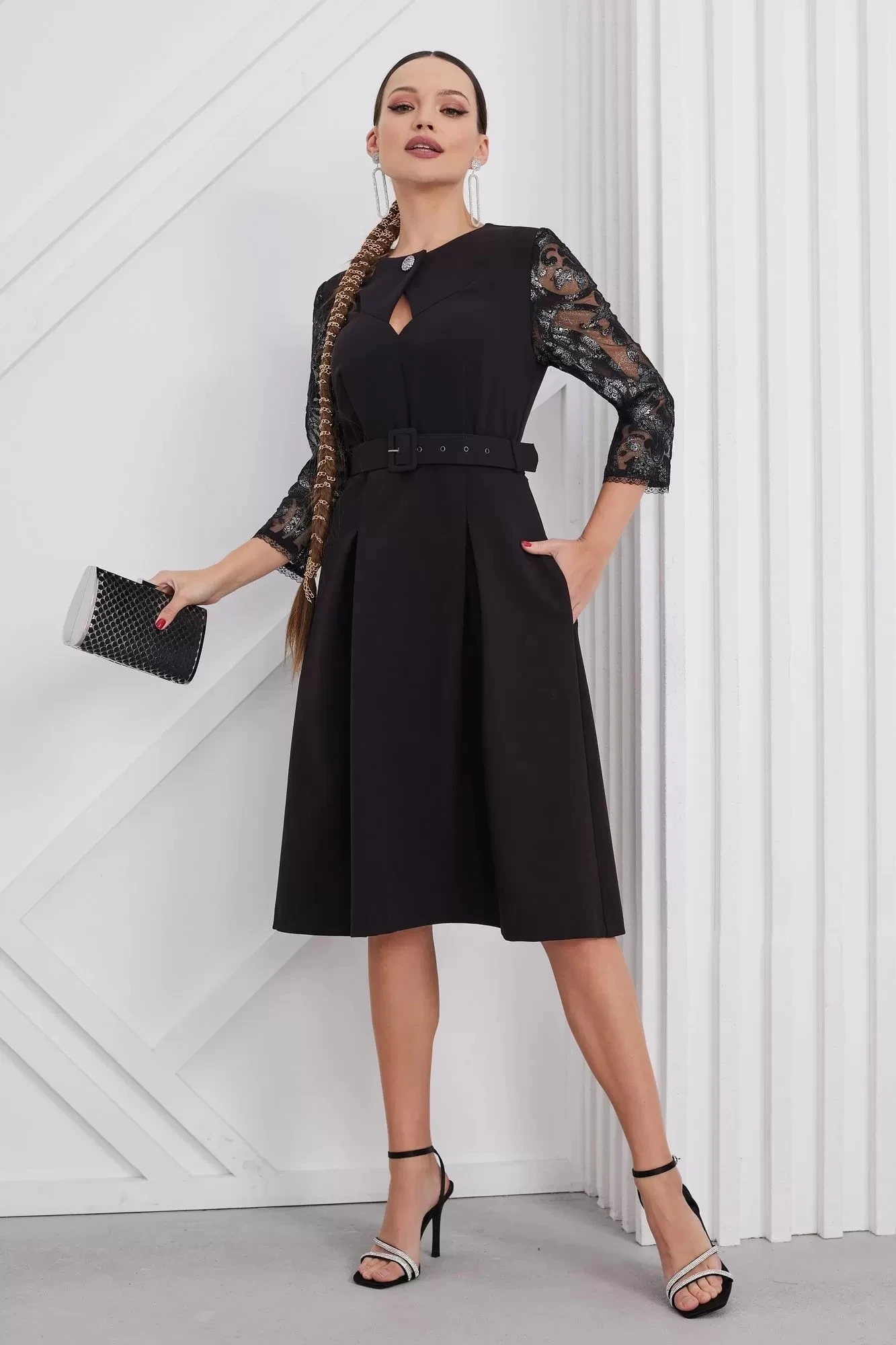Платье с округлым вырезом горловины и отрезное по талии. Перед с декоративной пуговицей в верхней части, фигурным вырезом и со складками в нижней части. Спинка с потайной молнией в среднем шве и талиевыми вытачками. Рукава втачные, выполненные из ажурной сетки с серебристым напылением. Изделие со съёмным поясом по талии и карманами в боковых швах.