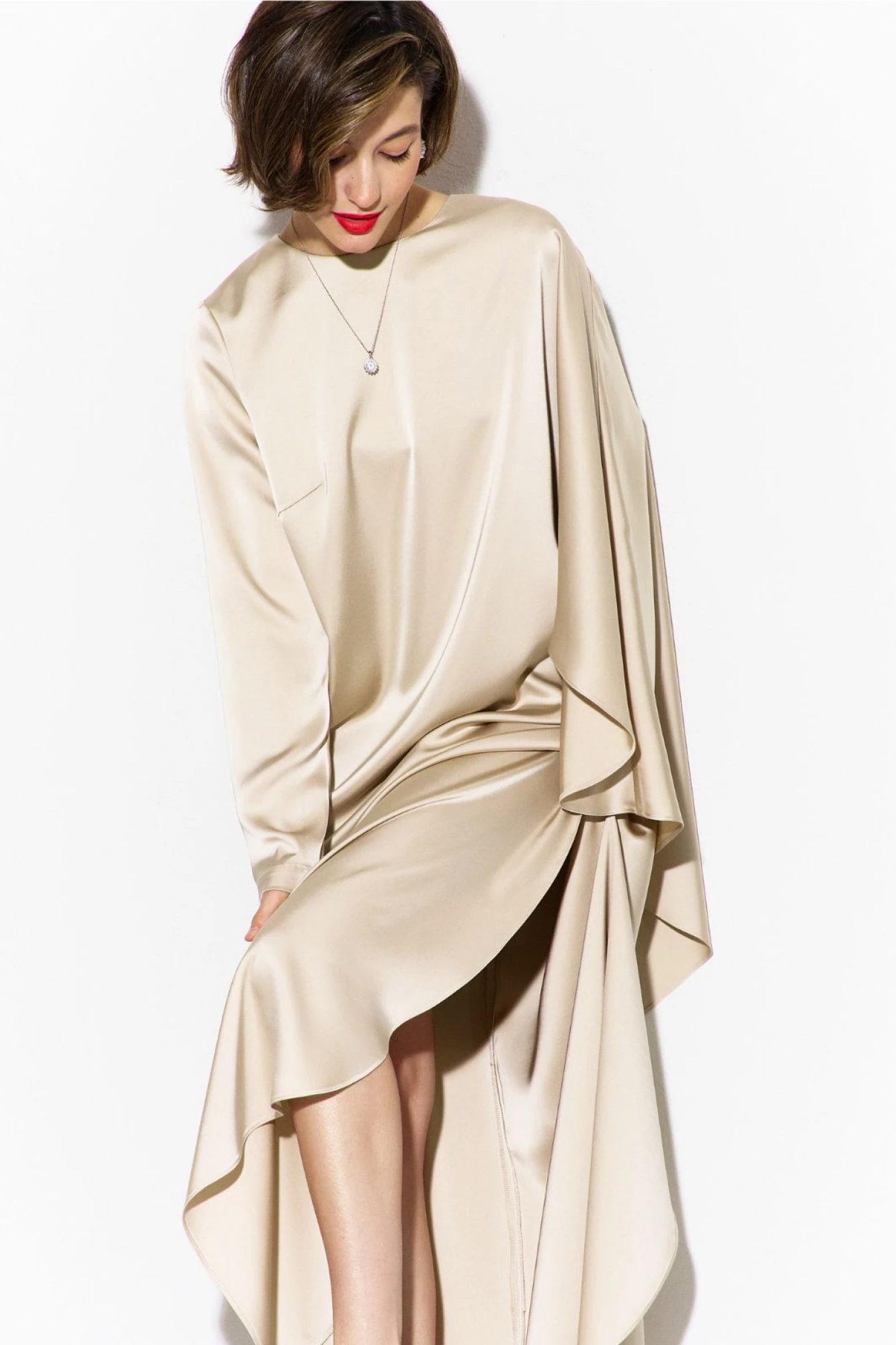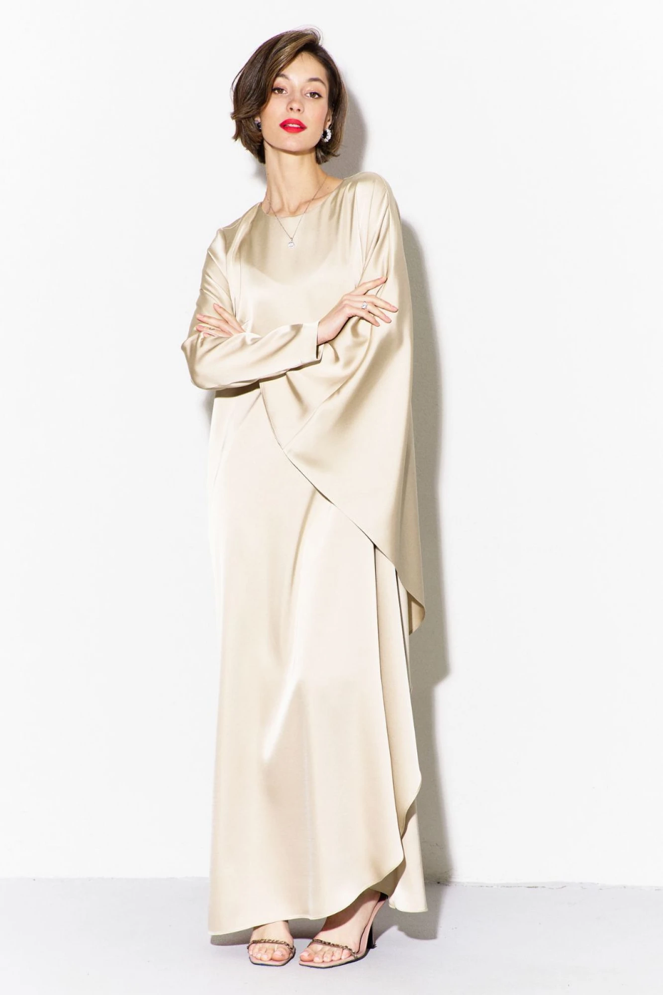 -платье ассиметричное: с левой стороны рукав цельнокроеный «летучая мышь», с правой стороны – втачной, длинный рукав