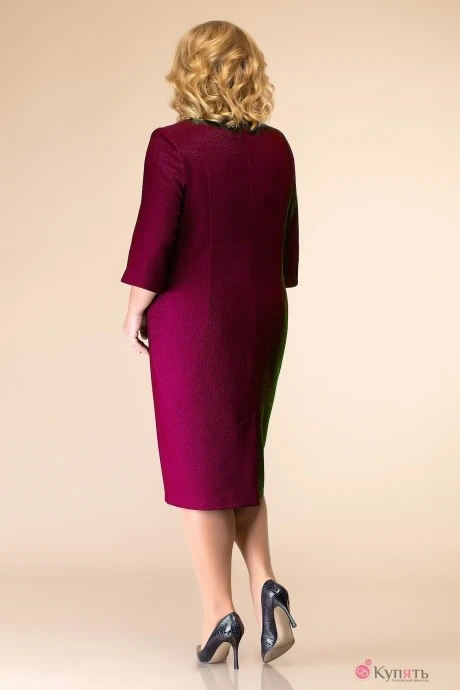 Платье женское, относится к нарядной торжественной одежде, но может использоваться и для повседневной носки. Платье полуприлегающего силуэта, длиной за колено. Перед с двумя отрезными бочками, с двумя карманами, фиксирующимися на тесьму с кнопками, центральная часть переда асимметричная с имитацией планки. Спинка с двумя талиевыми вытачками, со средним швом, заканчивающимся шлицей, вверху среднего шва разрез, фиксирующийся на одну навесную петлю и одну пришивную пуговицу. Горловина фигурная, обтачная, без воротника. Рукав втачной, двухшовный, расширен к низу с обтачным низом. Застежка на потайную тесьму-молнию в левом боковом шве платья. Перед платья декорируется 16-ю пришивными бусинами и тремя отделочными цветами. Платье с плечевыми накладками.
