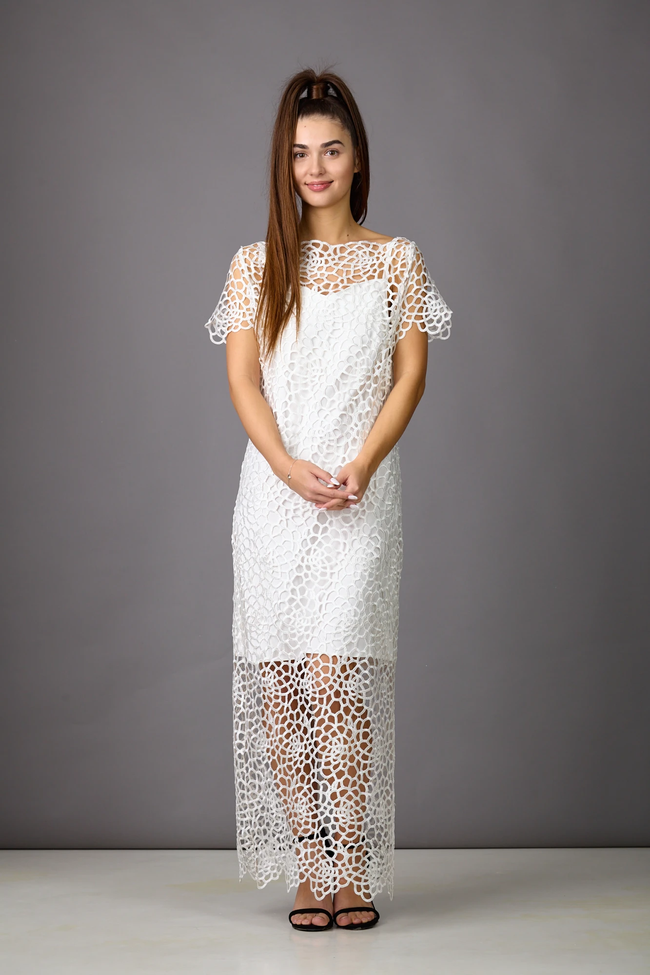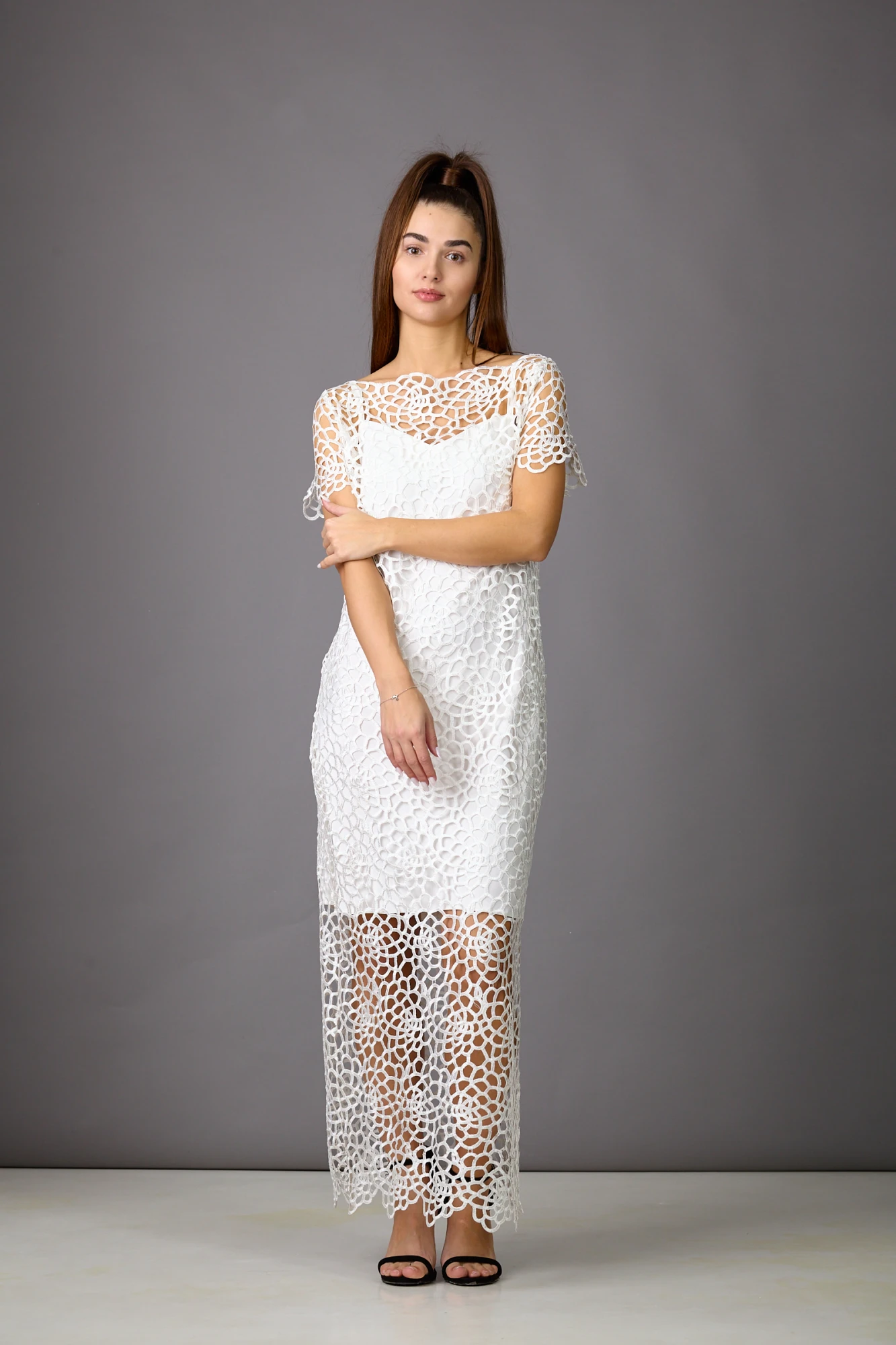 Платье из кружева прямого силуэта с вытачками по переду. Рукава короткие. Нижнее платье- комбинация из плотного атласа. Крой по косой. Нижнее платье можно использовать как самостоятельное изделие. Длина платья из кружева-135см, длина рукавов-19см, длина нижнего платья-80-85см