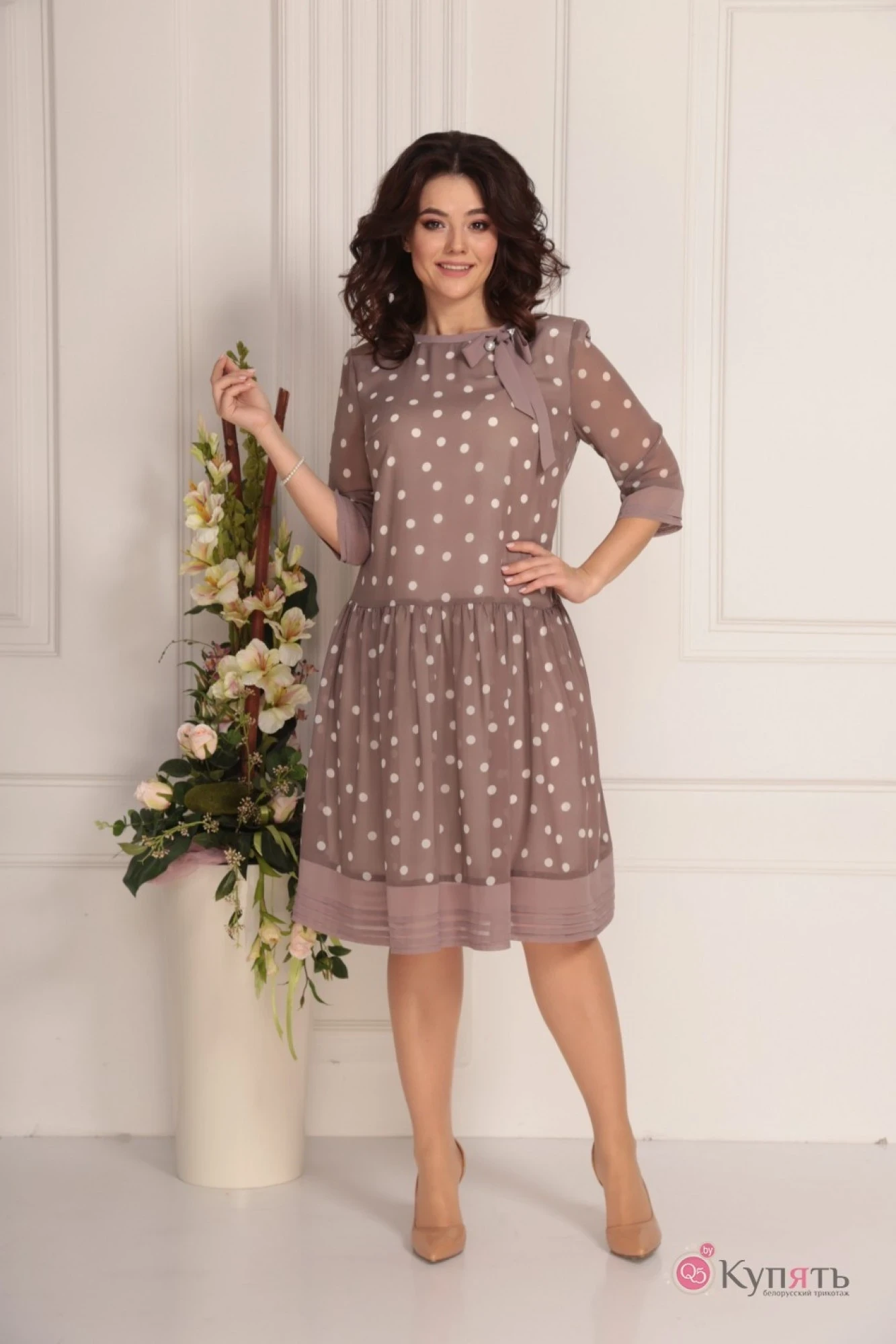 Платье женское, свободного силуэта из шифона на трикотажной подкладке. Рукава втачные, ниже уровня локтя, по низу пришиты манжеты из однотонной ткани, по манжетам застрочены горизонтальные складки. По платью ниже линии талии выполнен подрез, нижняя часть со сборкой , по низу пришита отделочная деталь с 3-мя складками из однотонной ткани. Горловина обработана планкой из однотонной ткани, по переду горловины пришит заготовленный бантик и с украшением.