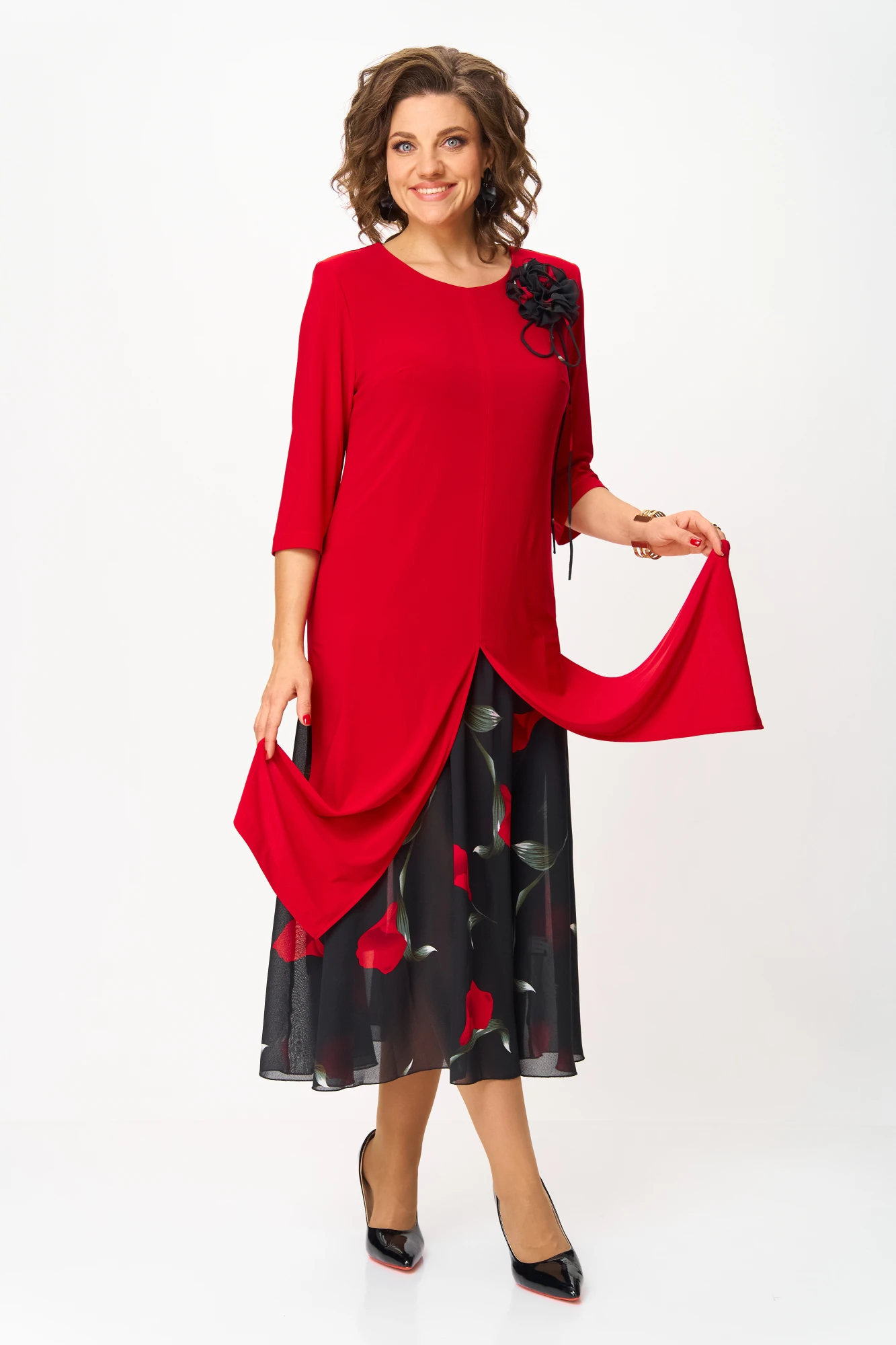 Платье женское полуприлегающего силуэта расширенное к низу, выполнено в комплектации из двух предметов. Верхнее платье –из мягкого эластичного материала, с высокими разрезами по переду, спинке и бокам, с втачным рукавом ¾. По линии груди вытачки. По левой части переда съемный цветок.