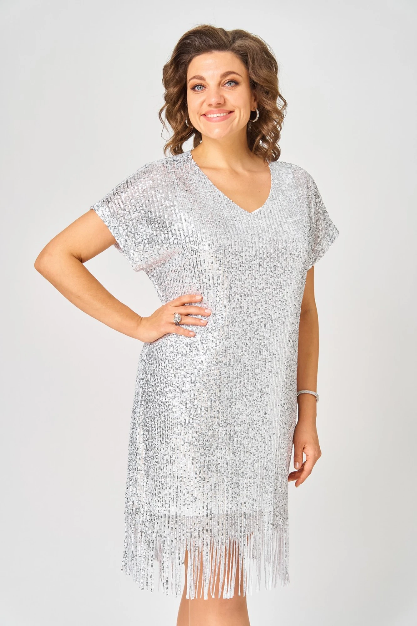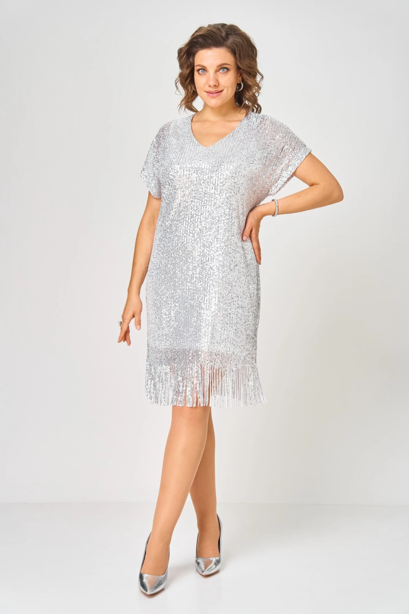 Платье нарядное с пайетками и бахромой прямого кроя, выполнено в комплектации из двух предметов. Линия плеча спущена. Вырез горловины v-образный. Нижнее платье полуприлегающего силуэта, на регулируемых бретелях. По линии груди вытачки.