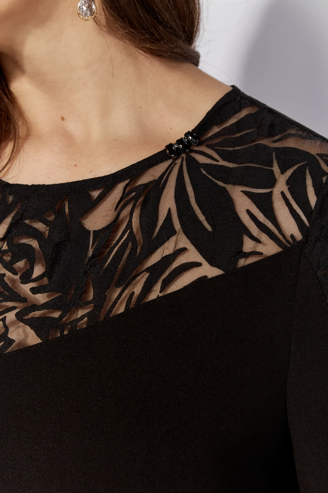 Платье женское А-образного силуэта с втачным рукавом длинной 3/4. Рукав расширенный к низу , с фигурной вставкой из отделочной ткани. По переду нагрудные вытачки и кокетка. Вырез горловины круглой формы с ассиметричным пришивным декором. По спинке средний шов, кокетка сложной формы с разрезом. Застежка сзади на навесную петлю и отделочную пуговицу. Вставки рукавов и кокетки выполнены из отделочной ткани(прозрачная органза с рисунком).