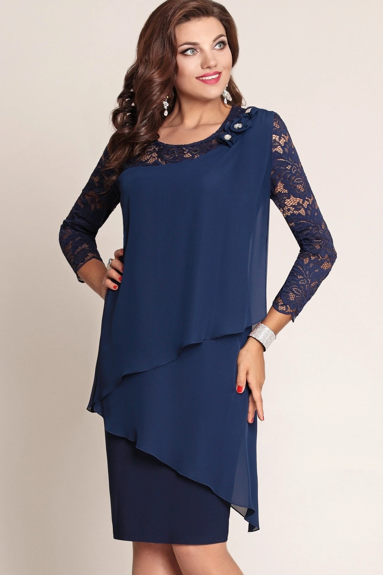 Платье женское, состоящее из двух частей. Нижняя часть полуприлегающего силуэта. Верхняя часть представляет собой накидку прямого силуэта из шифона. Накидка двухслойная с ассиметричным низом. В области горловины переда ассиметричная кокетка из кружева. В области левогоплеча по переду и спинке заложены односторонние складки. Рукав втачной одношовный из кружева.