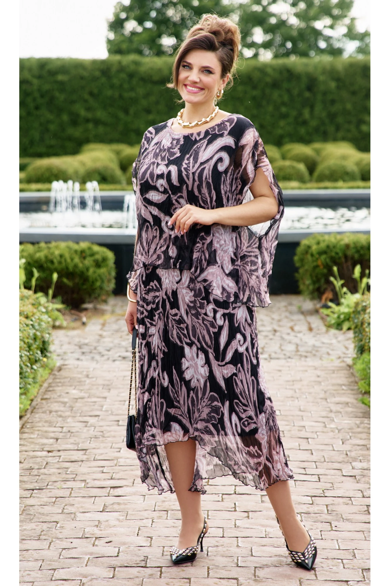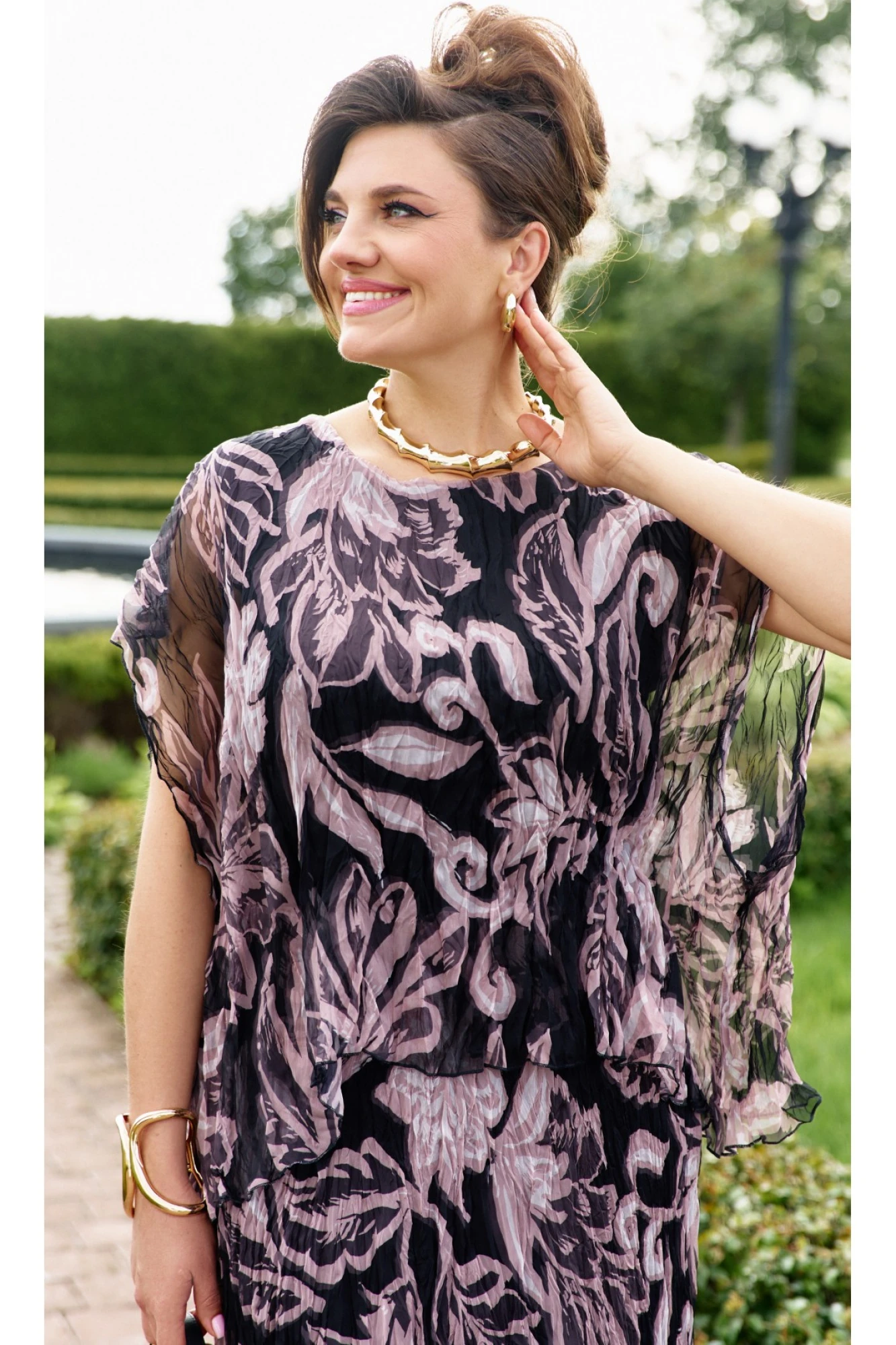 Платье, которое вскружит голову! Оно восхитительно смотрится на фигуре, подчеркивая ваши формы и скрывая недостатки. Представляем вашему вниманию эффектное платье, которое воплощает в себе изысканность и непринужденность. Изготовленное из легкой, полупрозрачной ткани с многослойной структурой, оно создает воздушный и динамичный образ. Узор из стилизованных листьев и абстрактных элементов в приглушенных тонах черного, серого и лилового придает платью особую глубину и выразительность. Свободный крой с короткими рукавами обеспечивает максимальный комфорт и позволяет платью струиться по фигуре, деликатно подчеркивая ее достоинства. Асимметричный низ добавляет современности и легкости, создавая игривый силуэт. Это платье идеально подходит для создания как элегантных дневных, так и вечерних образов, легко сочетаясь с различными аксессуарами. Оно станет незаменимым элементом гардероба для тех, кто ценит комфорт, индивидуальность и утонченный стиль. Верхняя часть платья отлетная на подкладке с цельнокроенным рукавом .Нижняя часть платья с расклешением, низ ассиметричный так же на подкладке.