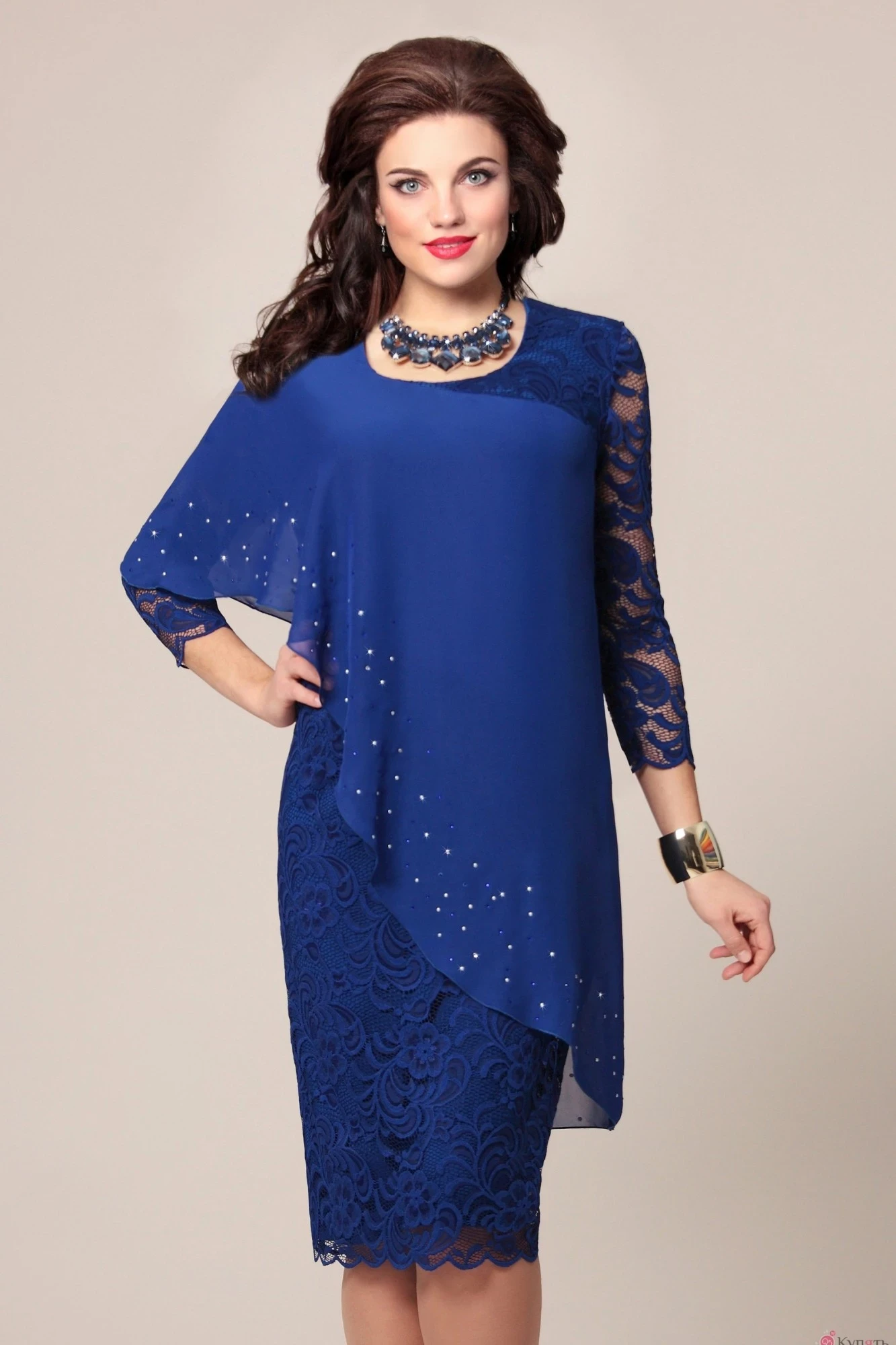 Чудесный наряд по любому поводу! Платье полуприлегающего силуэта из мягкого, но прочного гипюра на подкладке в тон. Поверх вшита шифоновая накидка, открывающая только один рукав и бедро с одной стороны и прикрывающая проблемные зоны. По краю на шифоне приклеены стразы "Swarowsky", что придаёт наряду ещё больше шарма. В таком платье каждая женщина будет чуствовать себя комфортно, т.к. эта модель вопреки всем нарядам - не стесняет движений, а наоборот придаёт им свободу.