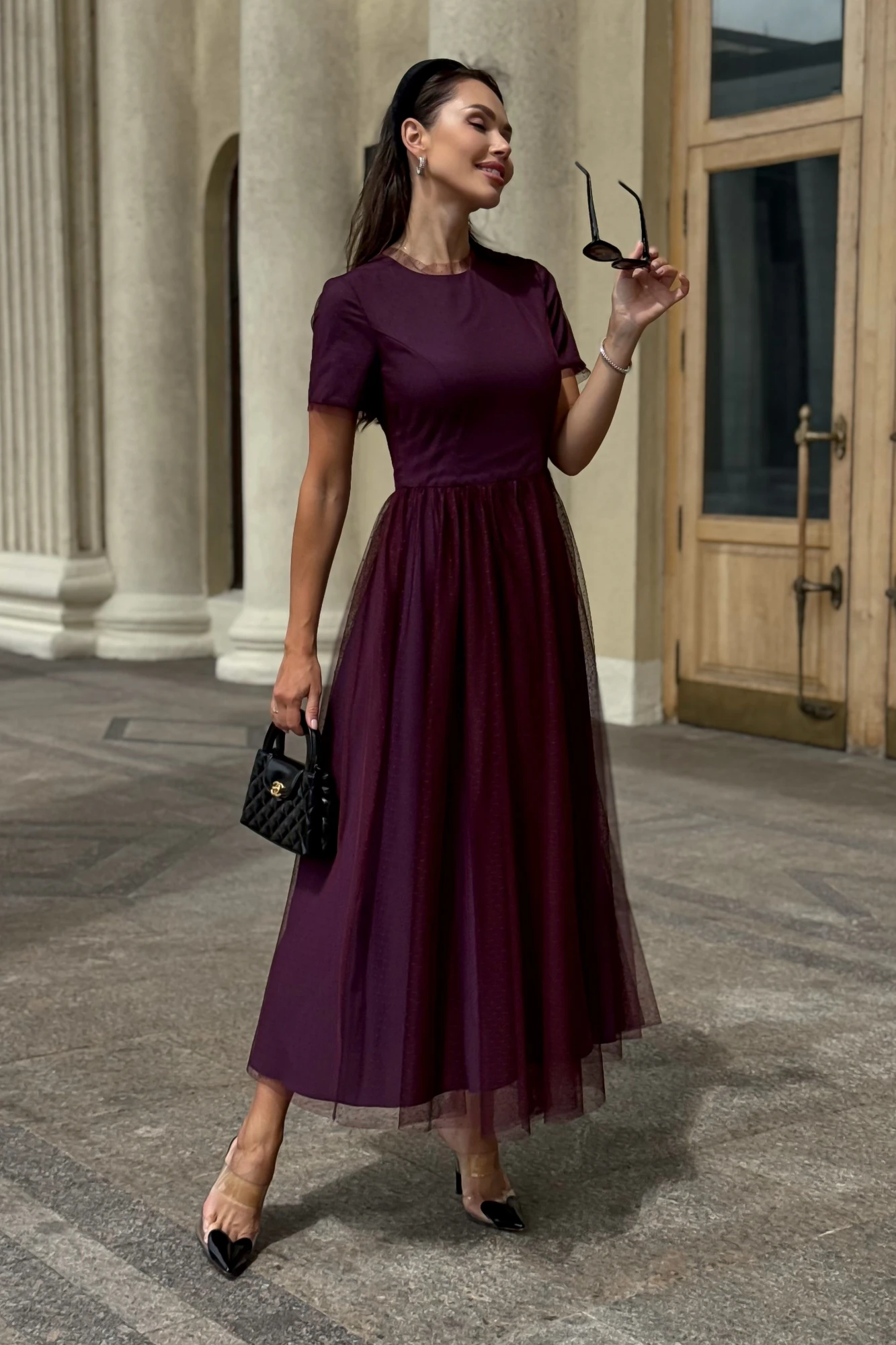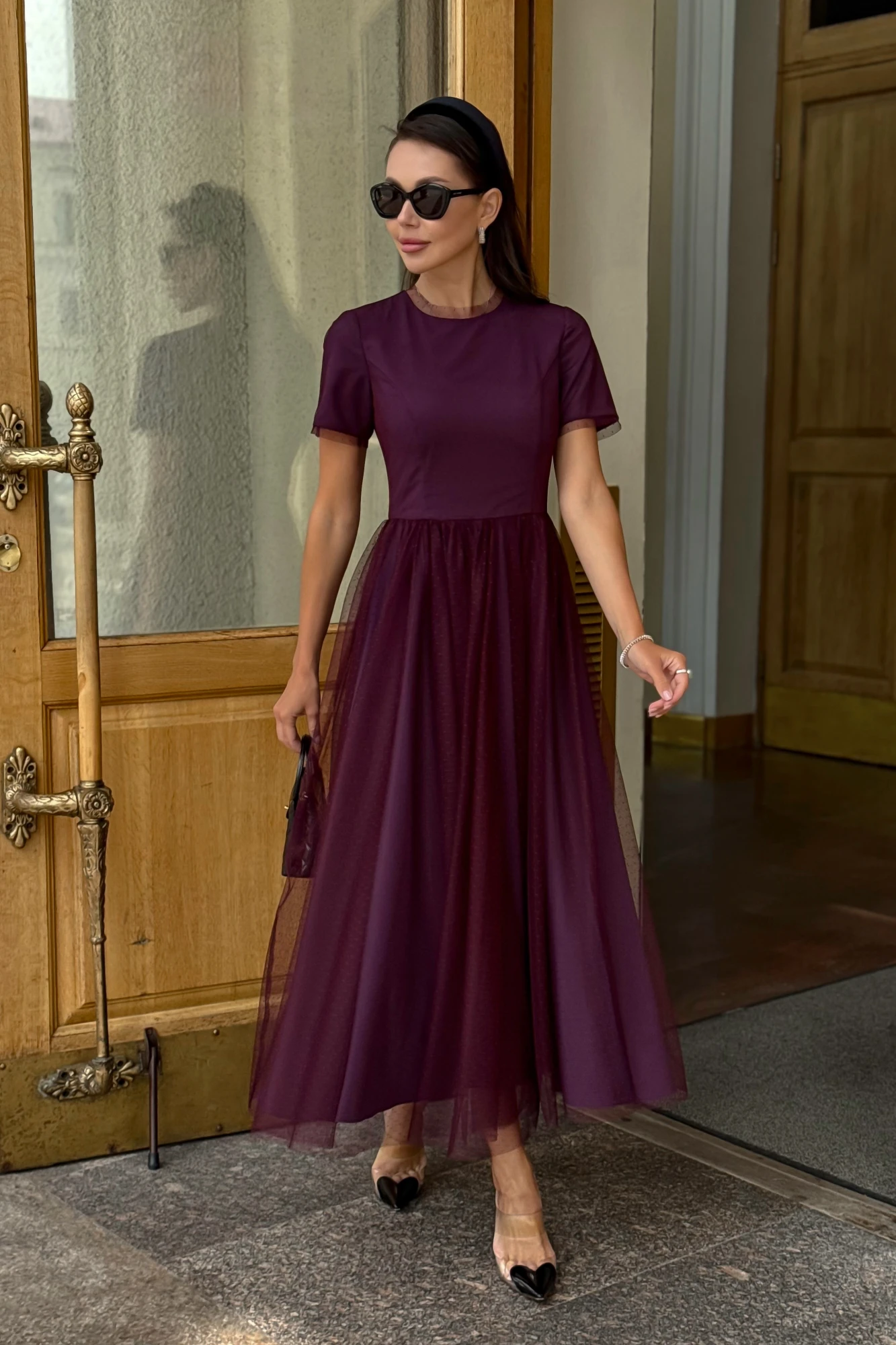 "Нарядное вечернее платье из фатина — это идеальный выбор для женщин, которые ищут элегантный образ для торжества, свадьбы, юбилея или праздничного мероприятия. Платье женское, полуприлегающего силуэта, отрезное по линии талии, двухслойное, выполнено из плательной ткани в сочетании с сеткой. Верхний слой из отделочной ткани - сетка, нижний слой из плательной ткани.