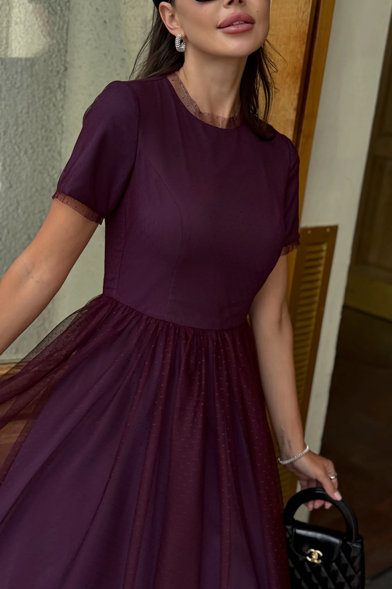 Нижняя часть переда и спинки (юбка) расклешенная к низу, двухслойная: нижний слой из плательной ткани, верхний слой из сетки, по срезу талии собранный на сборку.