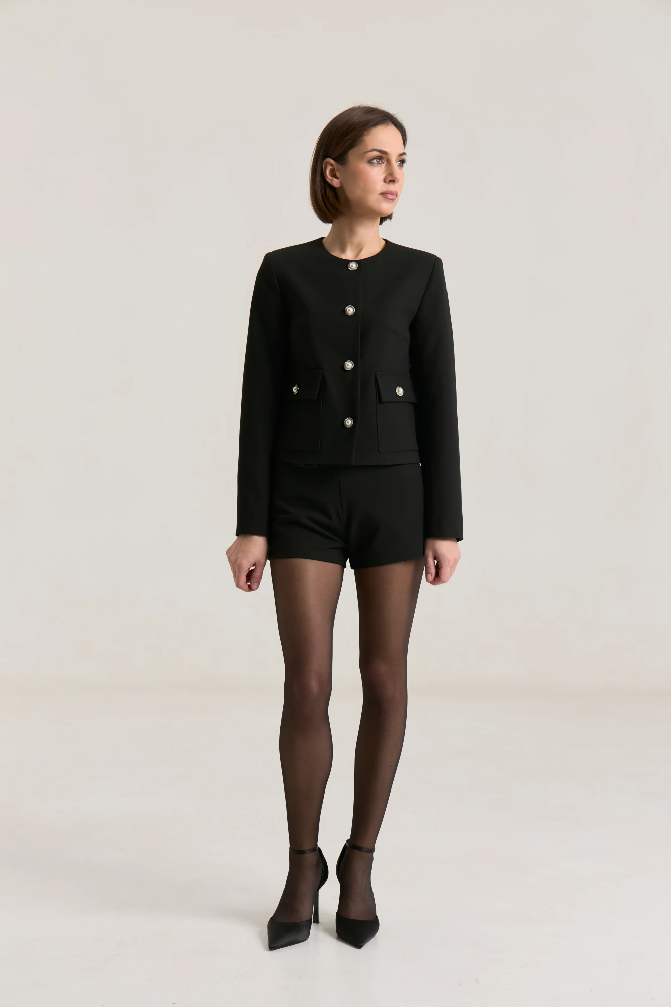 Шорты прилегащего силуэта, на подкладке, в боковом шве молния. Шорты выполнены из костюмной ткани черного цвета., можно дополнить жакетами из нашей коллекции арт. 2288 и арт. 2477. Шорты красиво сочетаются с жакетами свитерами, футболками, лонгами, летом можноносить с топами и босоножками.По боковому шву 36 см , полуобхват талии в 42-м размере 33 см.Рост модели 168 см.