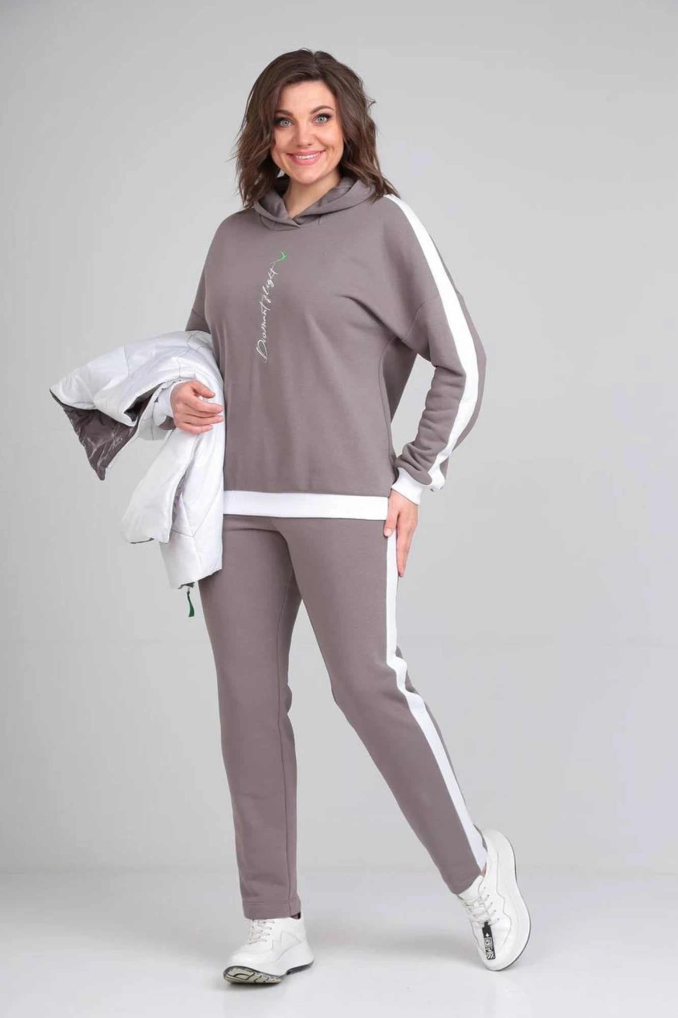 Комплект брючный(кофта +брюки+жилетка).Кофта прямого силуэта со спущенным плечом , рукав втачной одношовный с притачным манжетом, по низу изделия притачной пояс. Горловина обработана бейкой. По плечевому шву и рукаву лампас из отделочной ткани. Брюки прямые,верхний срез обработан поясом с резинкой и шнуром. По боковым швам лампас из отделочной ткани. Жилетка полуприлегающего силуэта с центральной застёжкой на тесьму-молнию,двусторонняя обработаны прорезные карманы с листочкой и накладные карманы с другой стороны. Используется две ткани. В качестве отделки используется отделочная строчка ,фурнитура,вышивка.