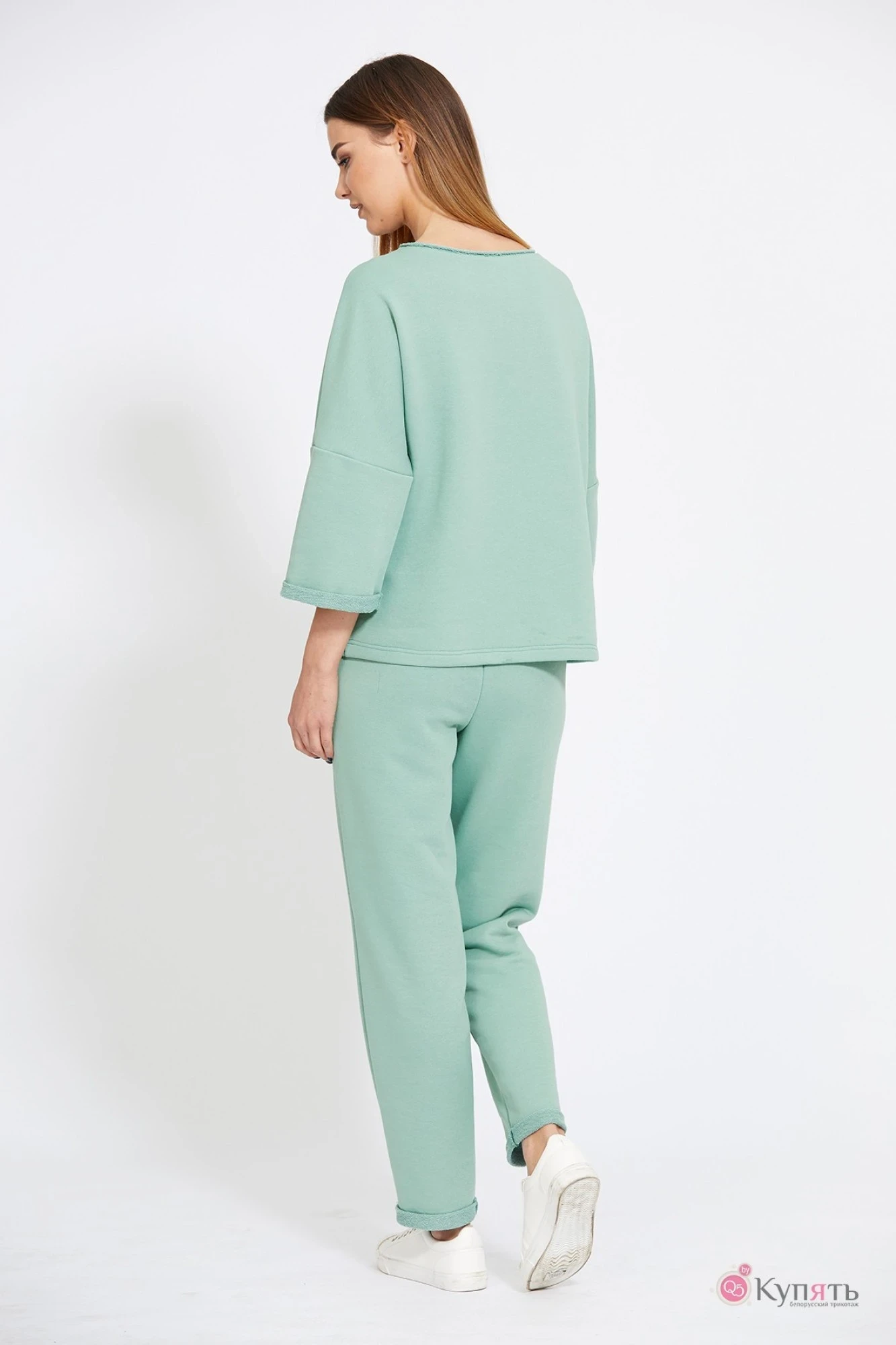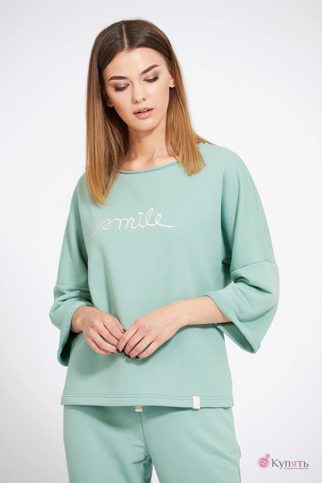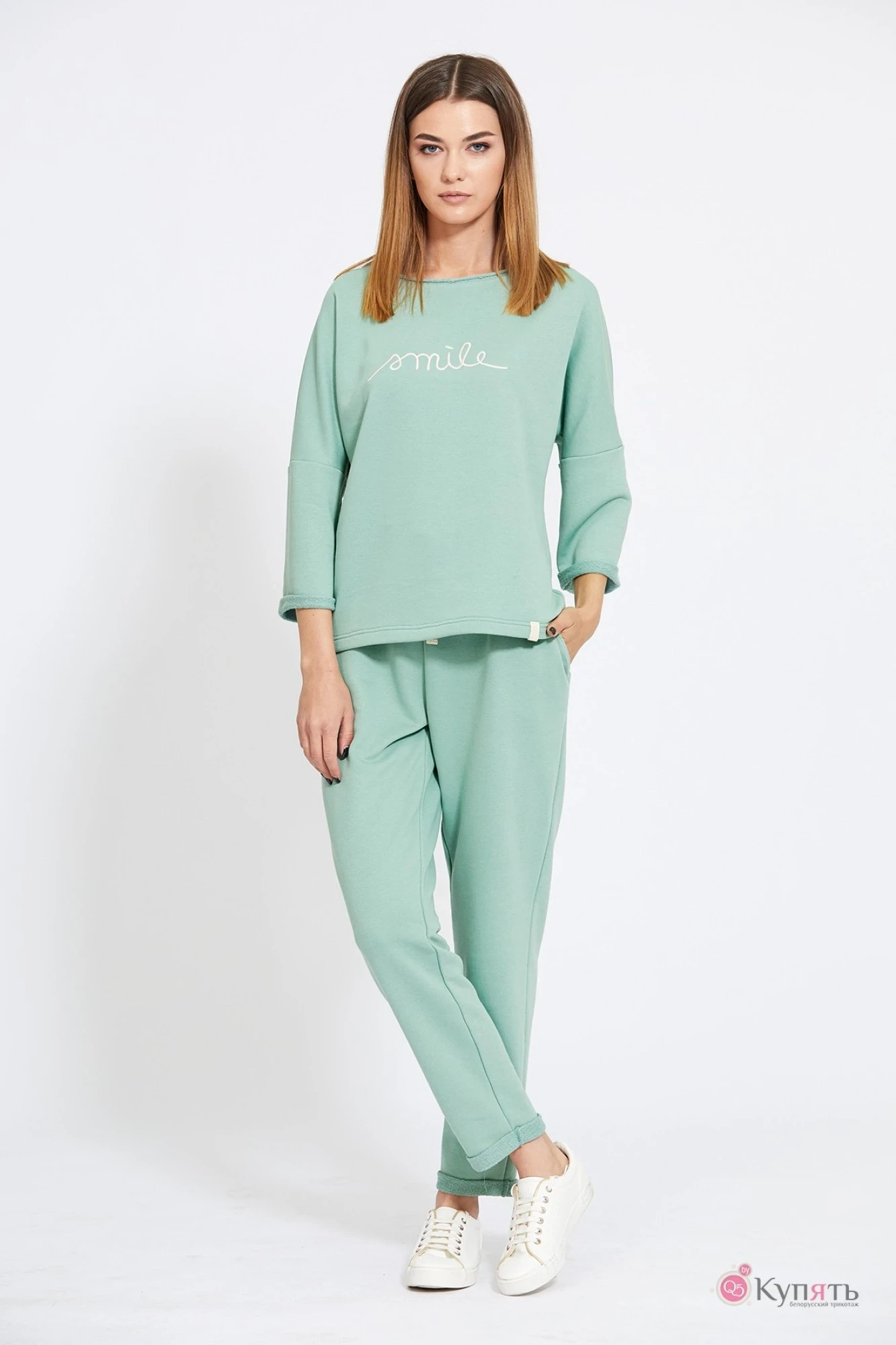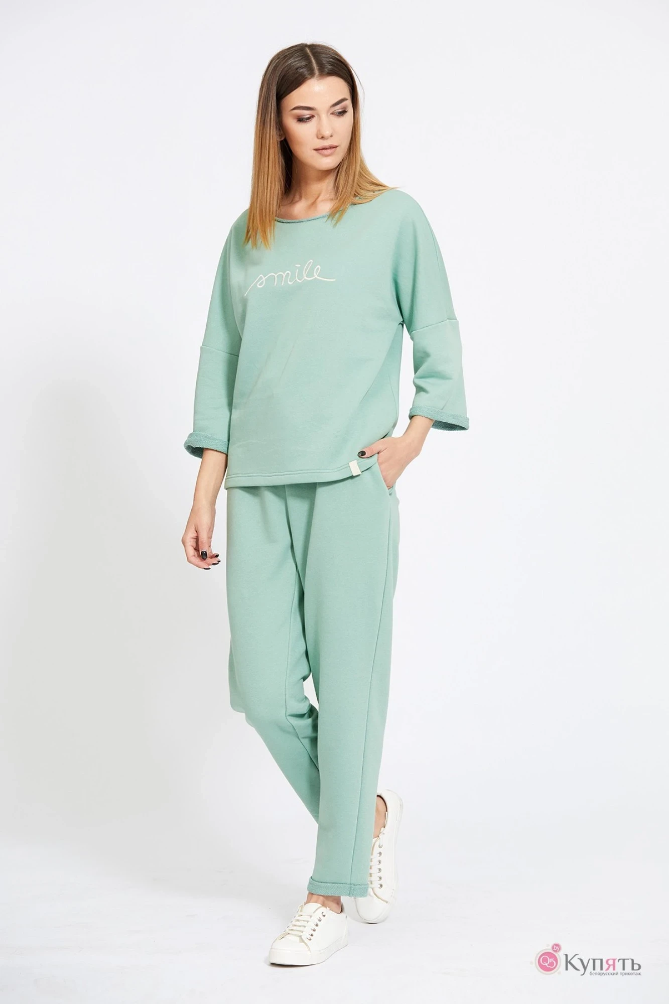 Комплект: джемпер + брюки. Комплект выполнен из однотонного трикотажного полотна. Джемпер прямого силуэта, длиной до линии бедер. Джемпер со спущенным плечом. Перед и спинка цельные. Горловина округлой формы, обработана бейкой. Рукав одношовный, длиной 3/4. Низ рукава на манжете-отвороте. Перед декорирован вышивкой "smile". Брюки на притачном поясе с эластичной тесьмой, заужены книзу, длиной 7/8. В пояс вставлен шнур. На передних половинках обработаны боковые карманы с наклонным фигурным входом. Низ брюк на манжете-отвороте.