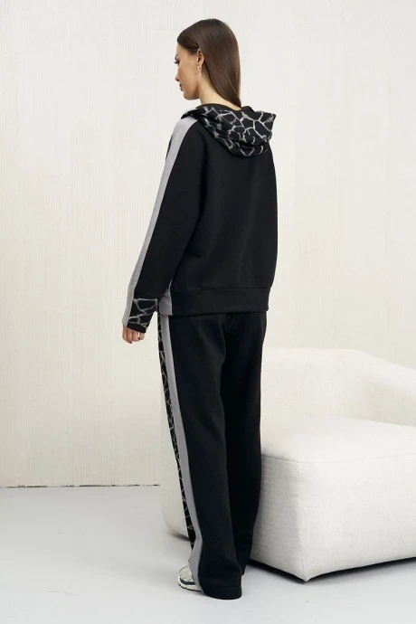 Перед тем, как отправиться на прогулку, шоппинг или активный вид отдыха, каждая из нас задумывается об одежде, которая будет практичной и одновременно стильной. Спортивный костюм с начесом по переду - что может быть удобнее ! Худи выполнен в стиле колор-блок. Покрой - реглан, есть капюшон. Полочка с центральной застежкой на тесьму-молнию и боковым карманом с листочкой. По низу рукава - притачной манжет. По низу изделия - притачной пояс. Брюки в расслабленном стиле. Высокая посадка, боковой карман с листочкой, эластичный пояс с люверсами и отделочным шнуром. Длина брюк около 104 см.