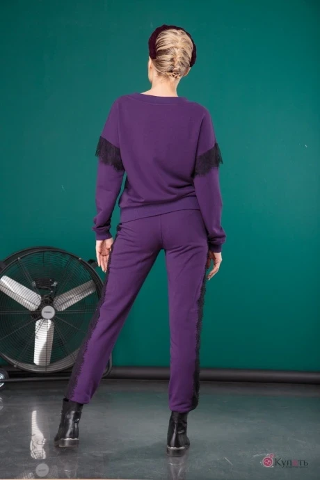 Костюм выполнен из футера трехнитки, без стрейча, но как и любой трикотаж имеет механическое растяжение. Свитшот свободного прилегания с надписью "smart girl" что в переводе означает "умница", плечо приспущено, переход на рукав украшен кружевом, которое так же украшает и боковые швы брюк в виде лампасов. В пояс брюк вставлена резинка и декоративная лента для дополнительной стяжки, по бокам карманы. Длина брюк по боковому шву с манжетой 102+-1см., по внутренней стороне 80см. Длина свитшота по спинке 54+-1см., длина рукава от горловины 69+-1см.