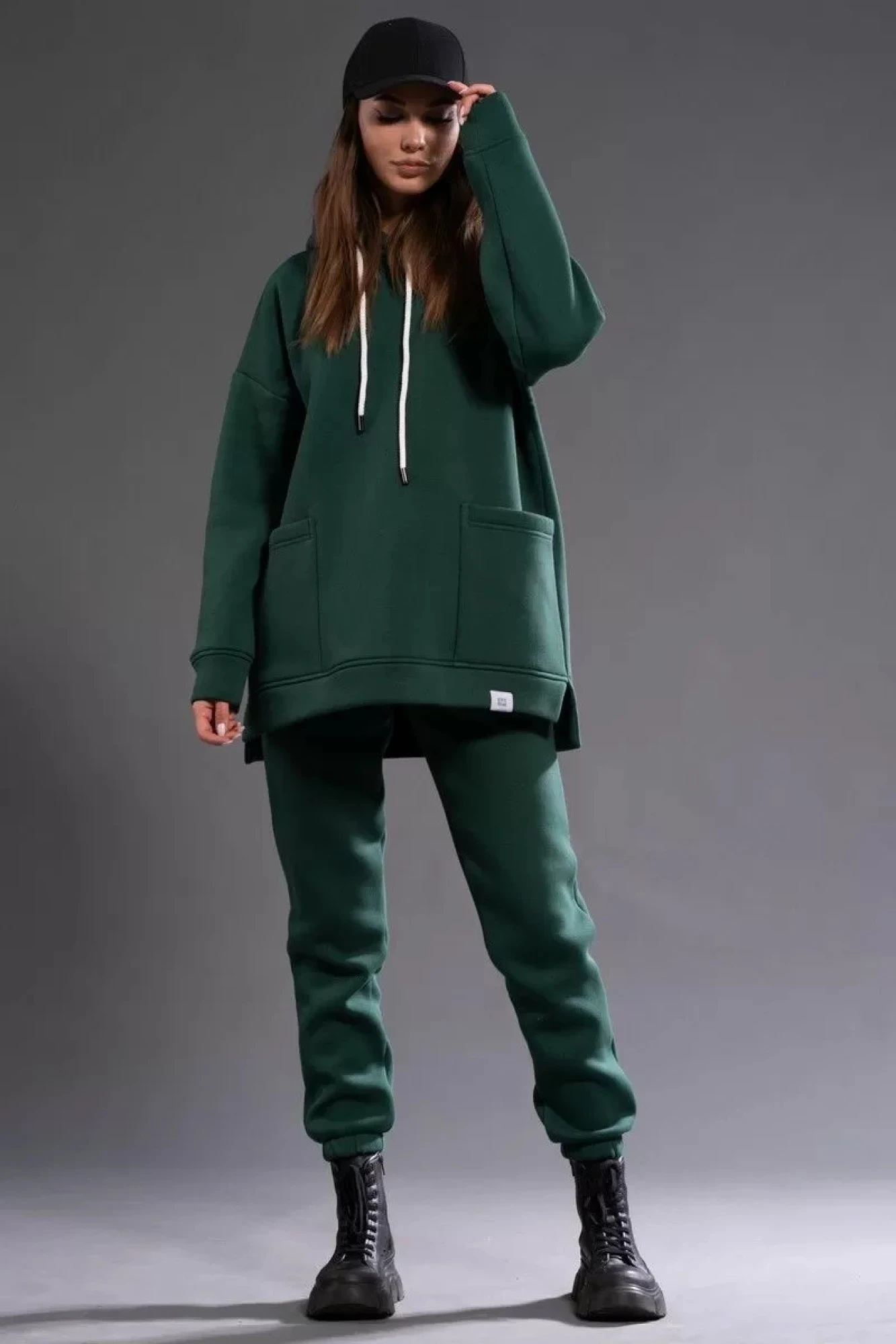 Костюм ОВЕРСАЙСЗ, утепленный на флисе. Худи Oversize модели 4057 с капюшоном на подкладке из основной ткани, с боковыми накладными карманами, с боковыми разрезами по низу изделия, удлиненная спинка. Брюки модели 4056 средней посадки зауженные к низу с карманами в боковых швах. Обработка низа брюк резинка. Ткань футер (3-х ниточный) с внутренним слоем утепленным начесом, качество Пенье, плотность 395 г.м2