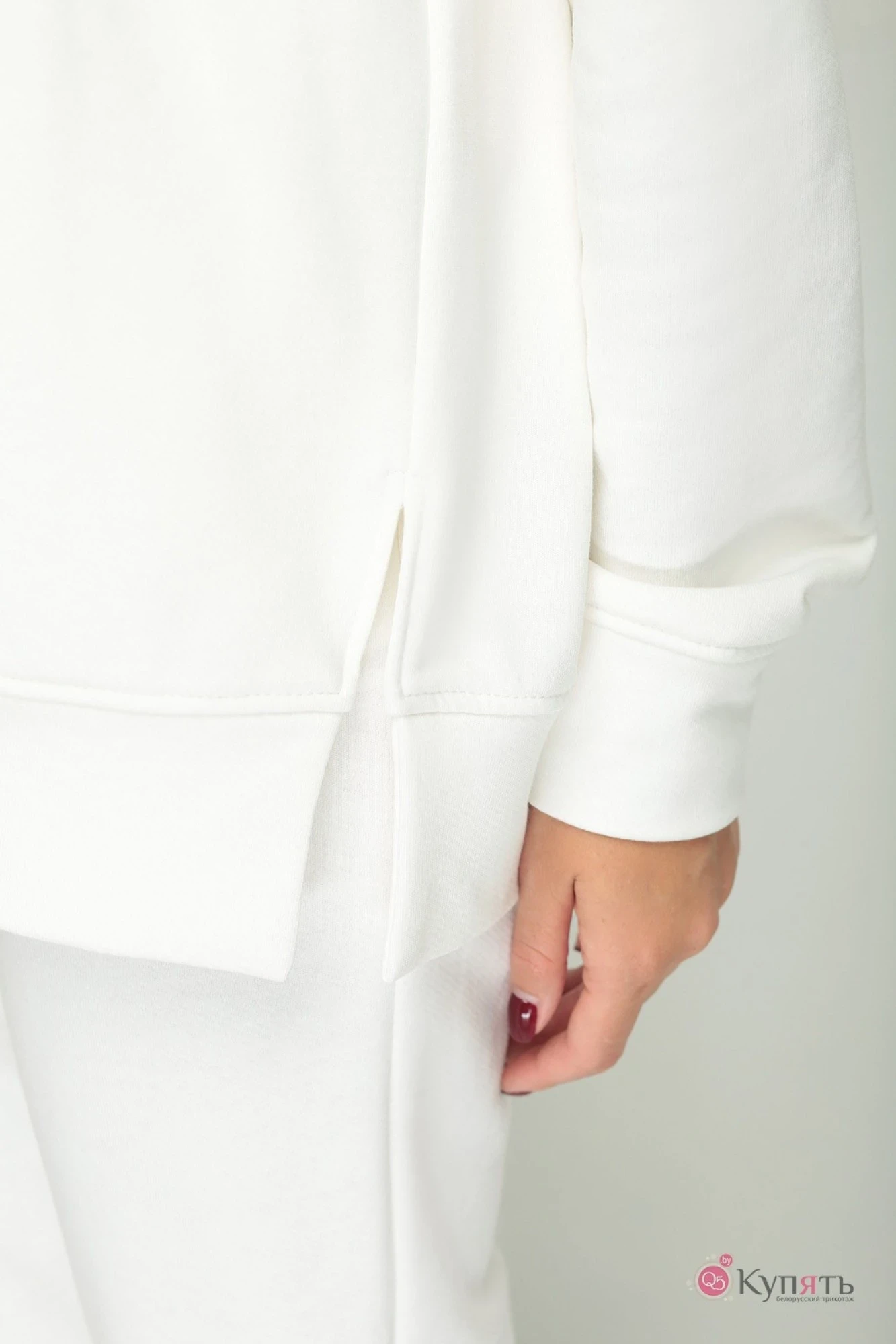 Стильный спортивный костюм для занятий спорта и отдыха подарит Вам ощущение комфорта и хорошее настроение. Важно - худи в стиле оверсайз, брючки обычные.Комплект женский, 2-х предметный, состоящий из худи и брюк. Худи прямого силуэта, без капюшона, со спущенной линией плеча. Рукав втачной длинный, вырез горловины округлый. Низ худи, низ рукава, планка горловины обработаны притачной планкой и манжетой из основного материала. В боковых швах имеются разрезы. Брюки на притачном поясе с резинкой по кругу. Задняя половинка брюк без конструктивных особенностей. Передняя половинка брюк с боковыми карманами- хулиганами. Низ брюк с притачным манжетом из основного материала.