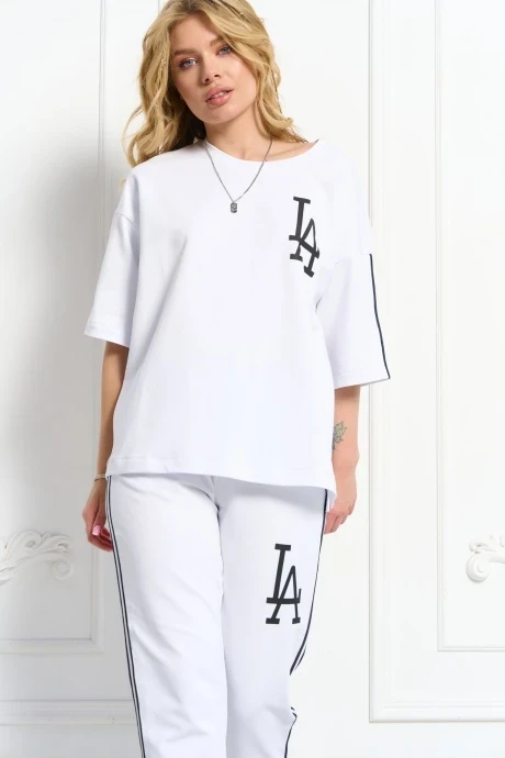 Джемпер прямого силуэта со спущенным плечом и втачным рукавом. Горловина на планке. Низ на широкой подгибке с разрезами по боковым швам. Спереди на полочке и на брюках декоративная печать.