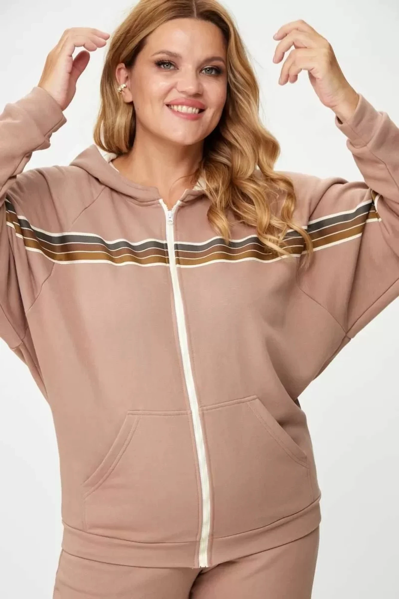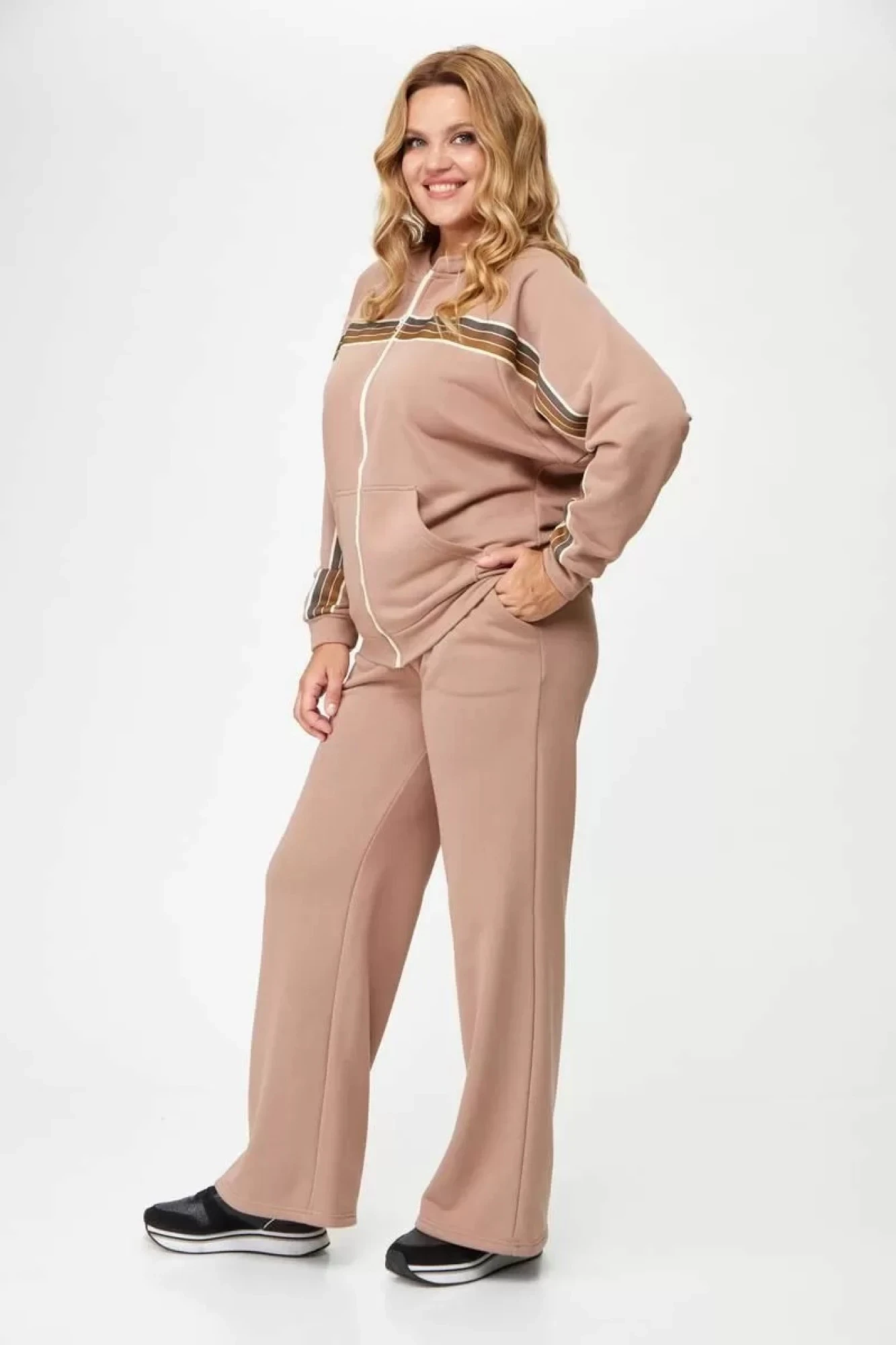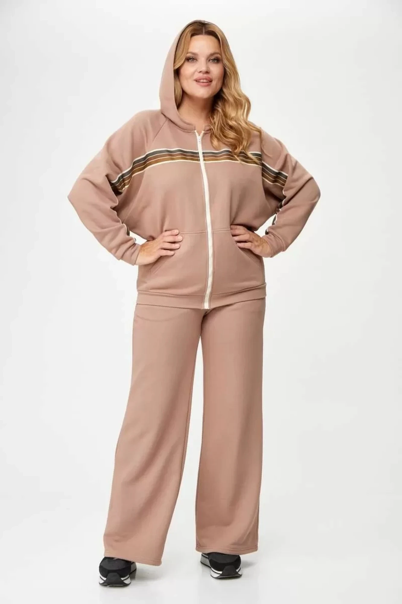 Костюм женский, брючный, спортивного типа из однотонного трикотажа «футер-трехнитка»— это удобная и стильная одежда на каждый день. Худи с капюшоном, покроя реглан, длинный рукав на манжете. Перед с центральной застежкой на молнию и карманом кенгуру, спинка цельная, низ худи с притачной планкой. По переду декор в виде настрочной декоративной тесьмы- лампаса от центра полочки с переходом на рукав вдоль манжеты. Внутренная часть капюшона выполнена из контрасной ткани. Брюки длинные, клеш, на притачном поясе с резинкой, по переду брюк имеются два кармана в боковых швах.