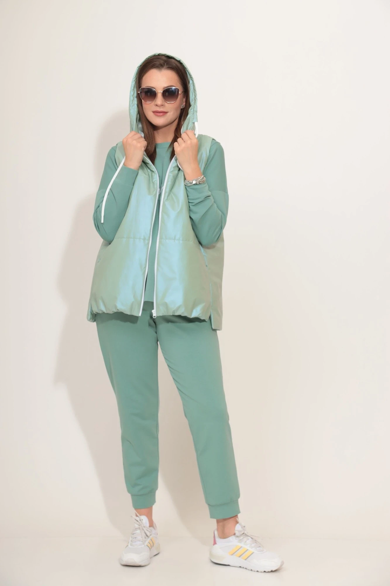 Комплект женский, 3-предметный, состоящий из жилета, свитшота и брюк. Жилет из плащевой ткани на синтепоне. По переду рельефы. В рельефах карманы. Вход а карман оформлен потайной молнией. Застежка спереди, центральная, на молнию. Горловина оформлена капюшоном с кулисой. Низ жилета разноуровневый (по спинке длиннее), чуть присборен. Снизу по рельефам небольшие разрезы!. Спинка задекорирована дизайнерской вышивкой — птица «колибри». Жилет на подкладке. Свитшот прямого силуэта. По переду и спинке рельефы. Низ разного уровня, с притачными планками по бокам. Перед задекорирован вышивкой шнуром с пайетками. Рукав длинный, со спущенной линией плеча, снизу на манжете. Горловина круглой формы с притачной бейкой. Брюки прямые, снизу на манжете. По переду наклонные карманы. Пояс притачной с резинкой по кругу.