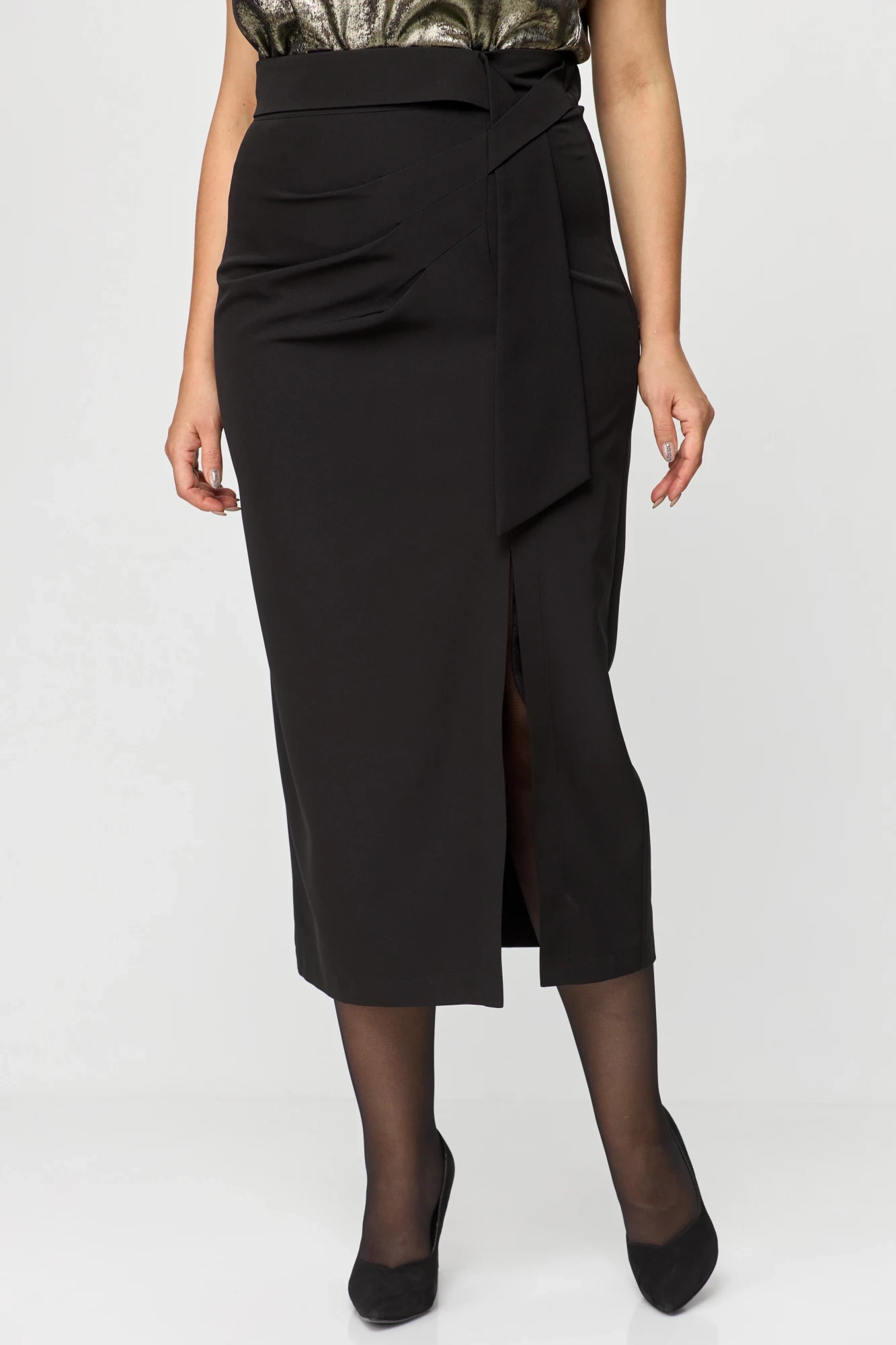 По передней половине юбки выполнены складки и левой стороны вертикальный шов, в нижней части которого обработан разрез.