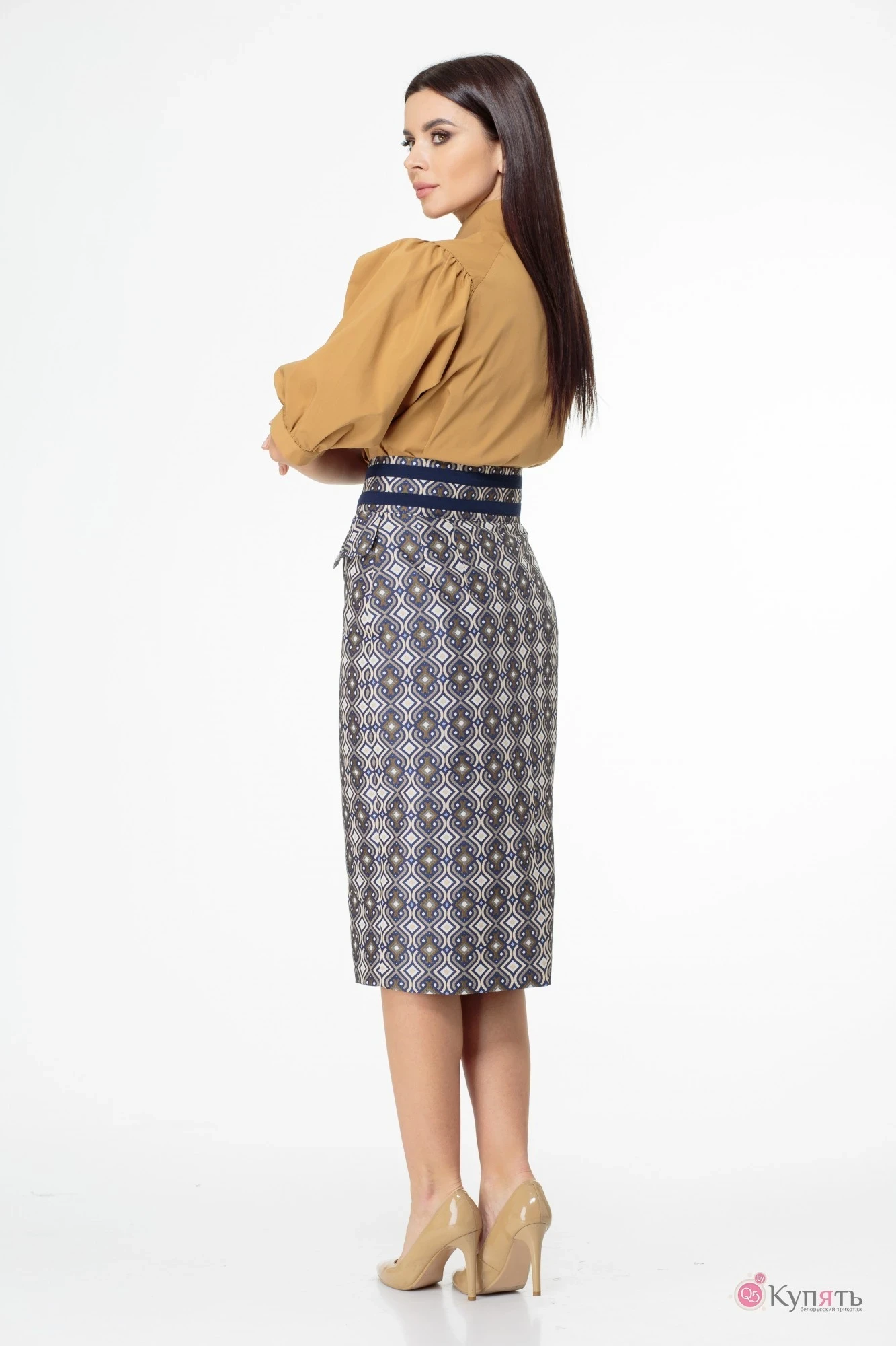 Прямой силуэт, притачной пояс с элементами отделки. Застёжка по переду по всей длине юбки на металлической разъемной молнии.