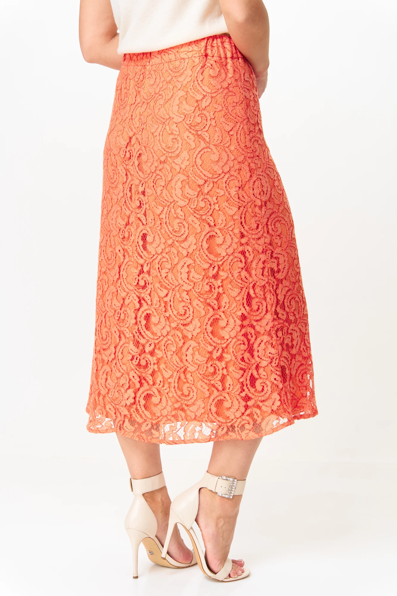 Юбка женская из гипюра для повседневной носки и торжественных случаев . Юбка расширена к низу , длиной ниже колена . Застежка на потайную молнию и вставки из эластичной тесьмы по бокам пояса, подчеркивают линию талии .