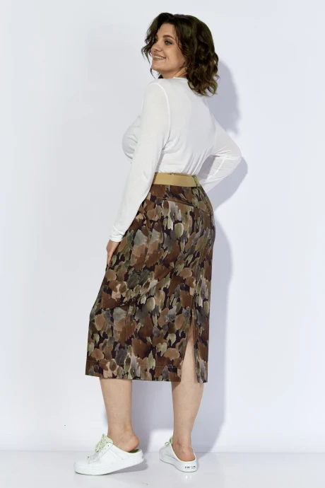 Юбка женская зауженная к низу с притачным поясом со шлевками, застегивающимися на 1 пуговицу с застежкой молнией. По передней и задней части изделия выполнен средний шов с обработанным разрезом. По переду выполнены боковые карманы. По задней части горизонтальная кокетка.
