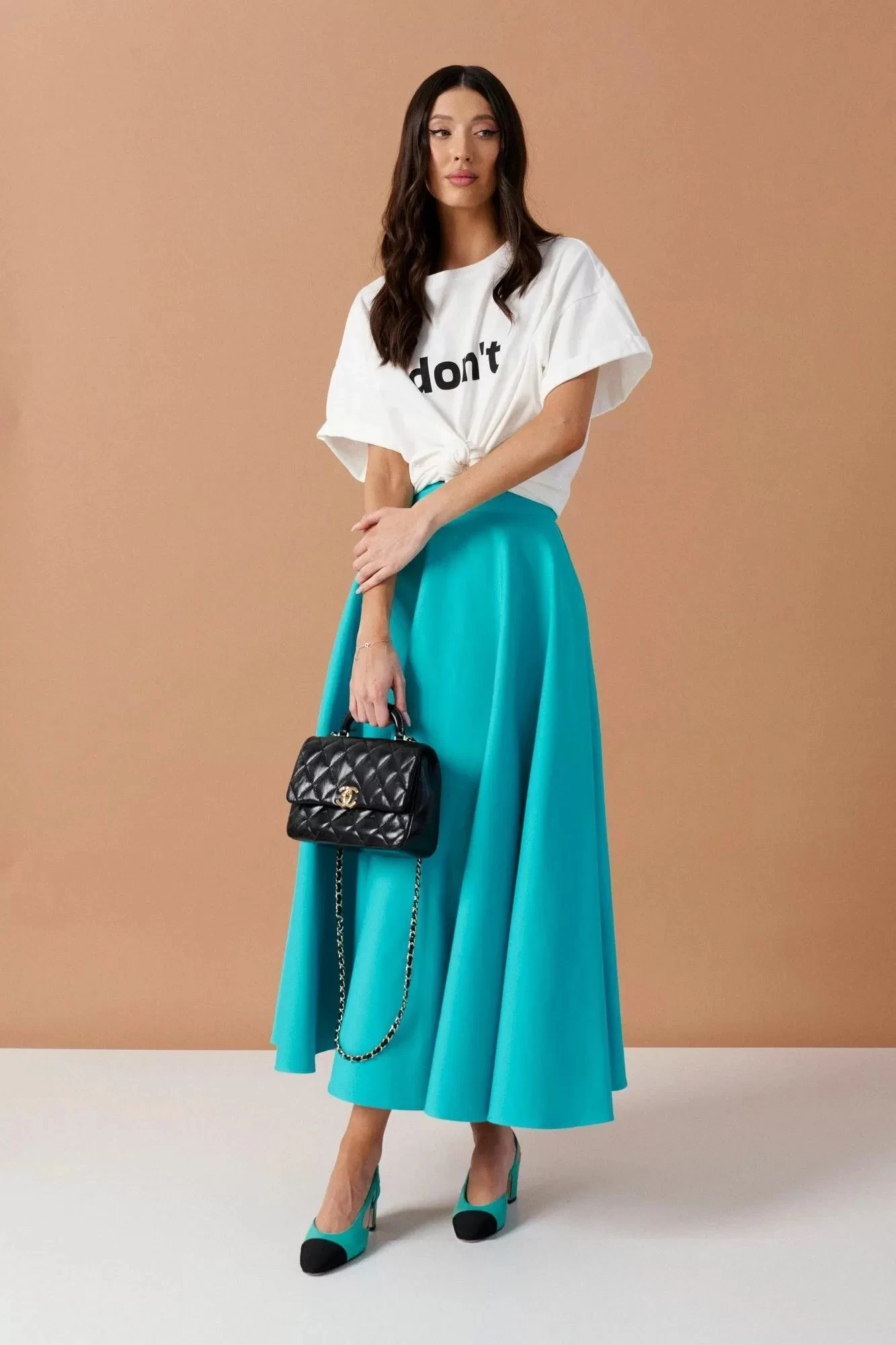 Юбка свободного кроя выполнена из джинсового полотна бирюзового цвета. Характеристики: А-образный силуэт, объёмная, пояс стабильный, в боковых швах карманы, застежка потайная тесьма молния в среднем шве заднего полотна изделия. Длина по спинке 89 см.