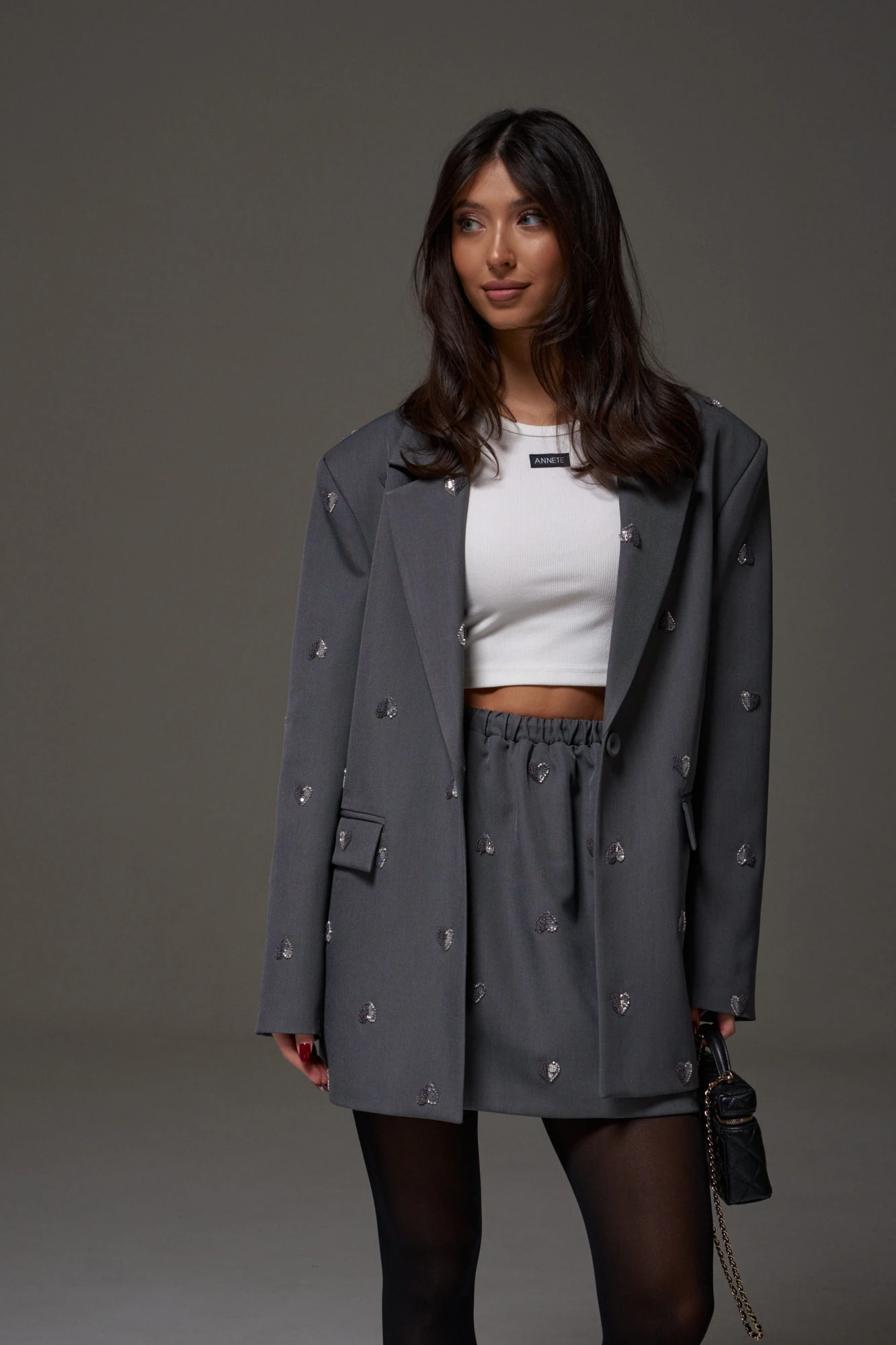 Юбка прямого кроя, выполнена из костюмной ткани серого цвета, с декоративной вышивкой в виде сердечек. Характеристики: прямой крой, на брендированной подкладке, пояс на резинке. Длина по боковому шву 44 см.