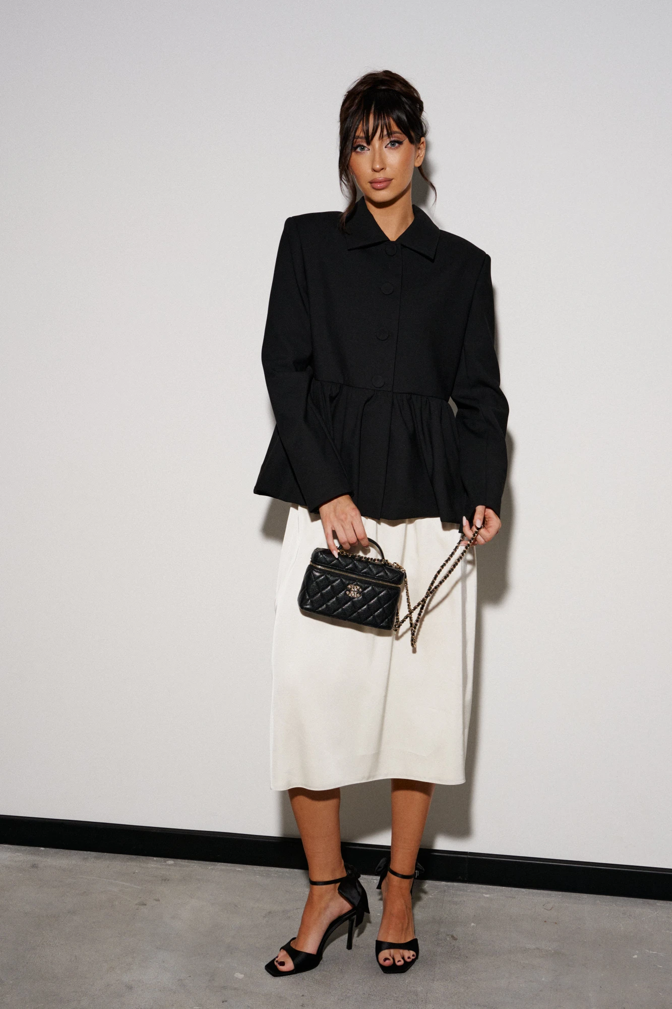 Юбка полуприлегающего силуэта выполнена из струящегося полотна молочного цвета на подкладке. Характеристики: полуприлегающий силуэт, пояс на резинке. Длина по боковому шву 77 см.