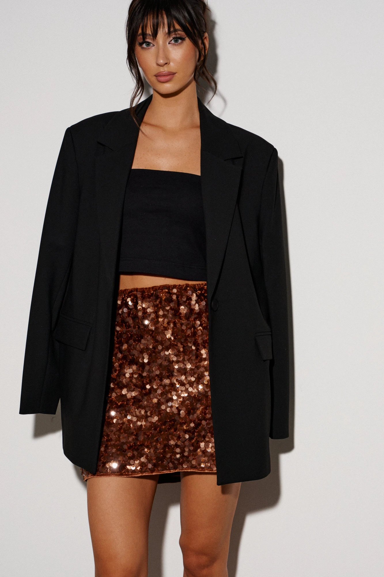 Юбка прямого кроя выполнена из бархатного полотна светло-коричневого цвета с пайетками. Характеристики: прямой крой, подкладка, пояс на резинке. Длина 41 см.