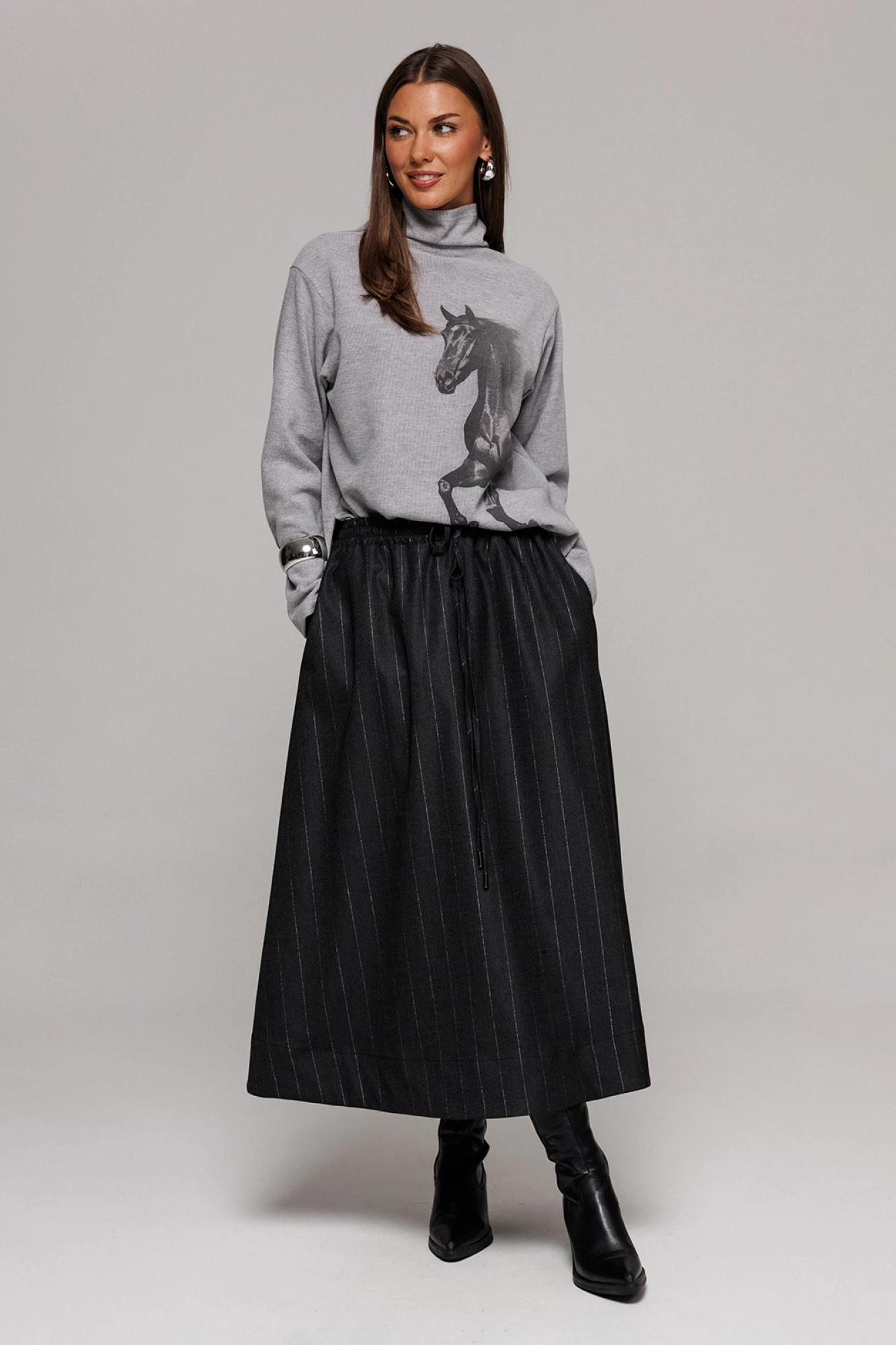 Юбка длиной миди из костюмной ткани в полоску из люрекса. А-силуэта на притачном отсроченном поясе на резинке со втянутым в него шнурком с наконечниками и карманами в боковых швах. По переду внизу нашивка "BUTER". Юбка без подкладки