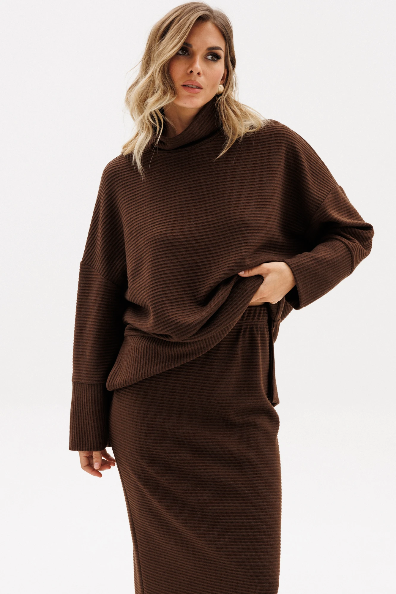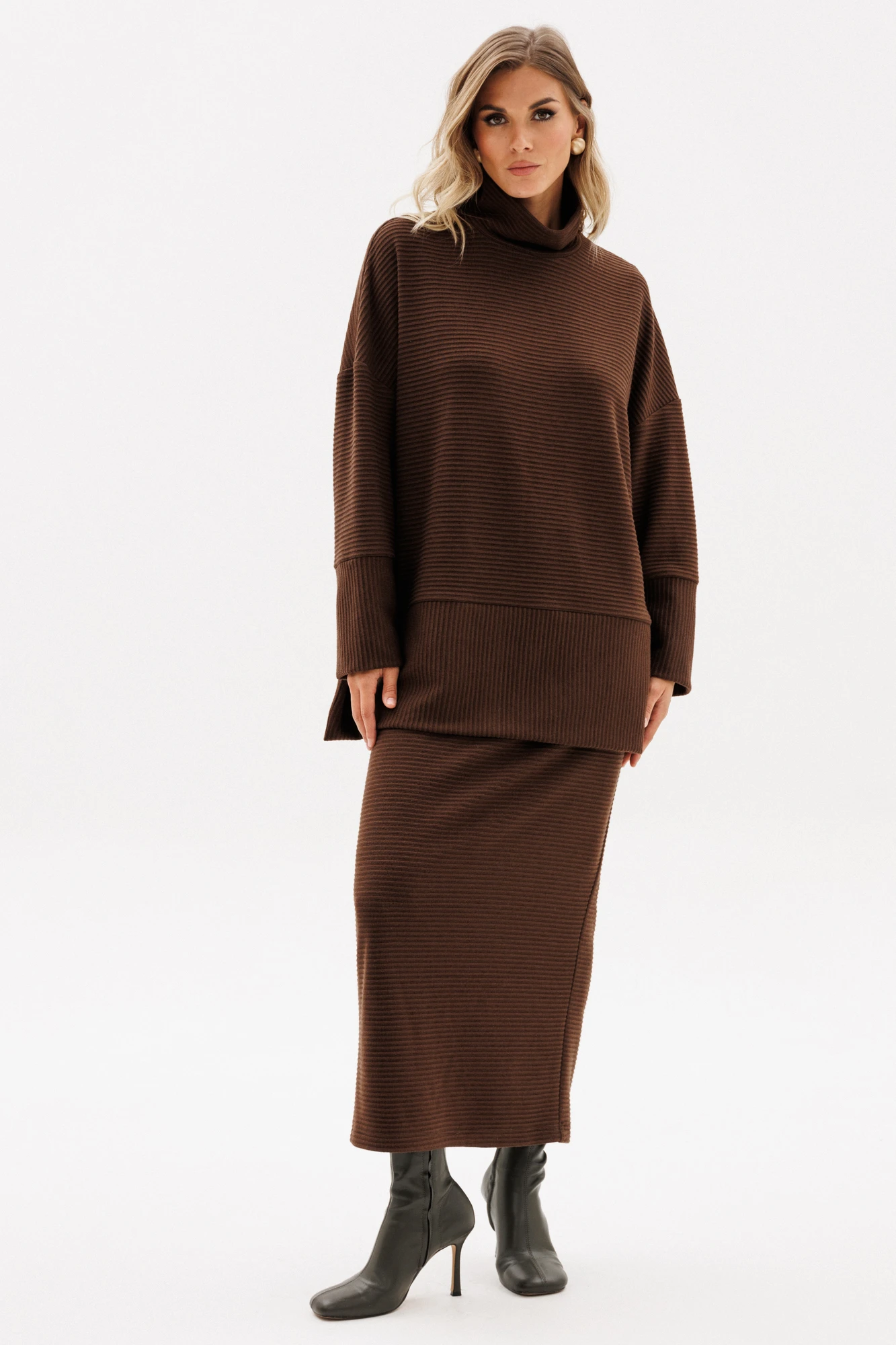 Юбка выполнена из трикотажного полотна в рубчик. Юбка прямого силуэта, длиной миди, на цельнокроеном поясе с эластичной тесьмой. Сзади разрез в среднем шве.