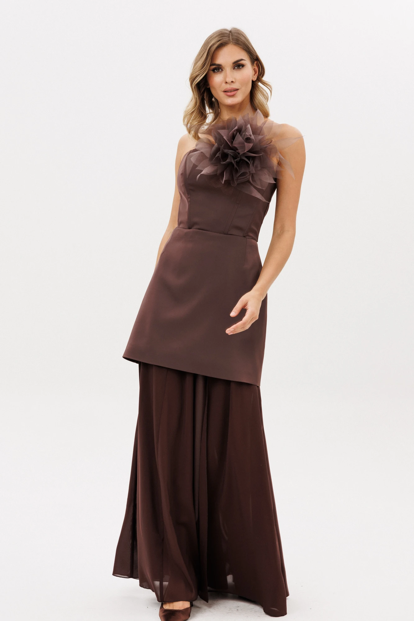 Юбка выполнена из шифона. Юбка А-образного силуэта, длиной в пол. Юбка на притачном поясе с эластичной тесьмой. Юбка состоит из 6 клиньев. Спереди слева разрез. Юбка без подкладки.
