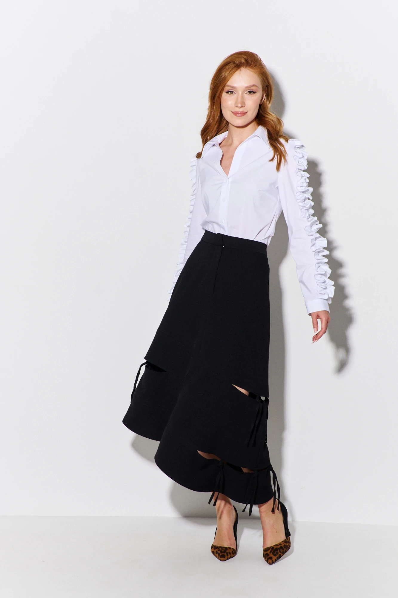 Юбка-ассиметрия без подкладки А-силуэта с разрезами выполнена из костюмной ткани в черном цвете, застежка-молния по переднему полотнищу юбки, верх юбки обработан поясом с застежкой на петлю и пуговицу. Длина юбки 74 см по меньшему краю, 91 см по большему краю.
