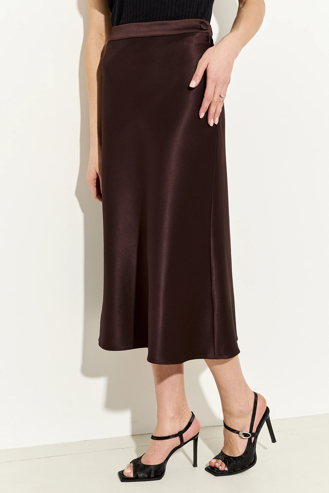 Юбка миди прилегающего силуэта из струящейся сатиновой ткани с добавлением шелка; пояс притачной, в боковые швы которого вставлена резинка для лучшего прилегания; застежка на молнию , петлю и пуговицу.