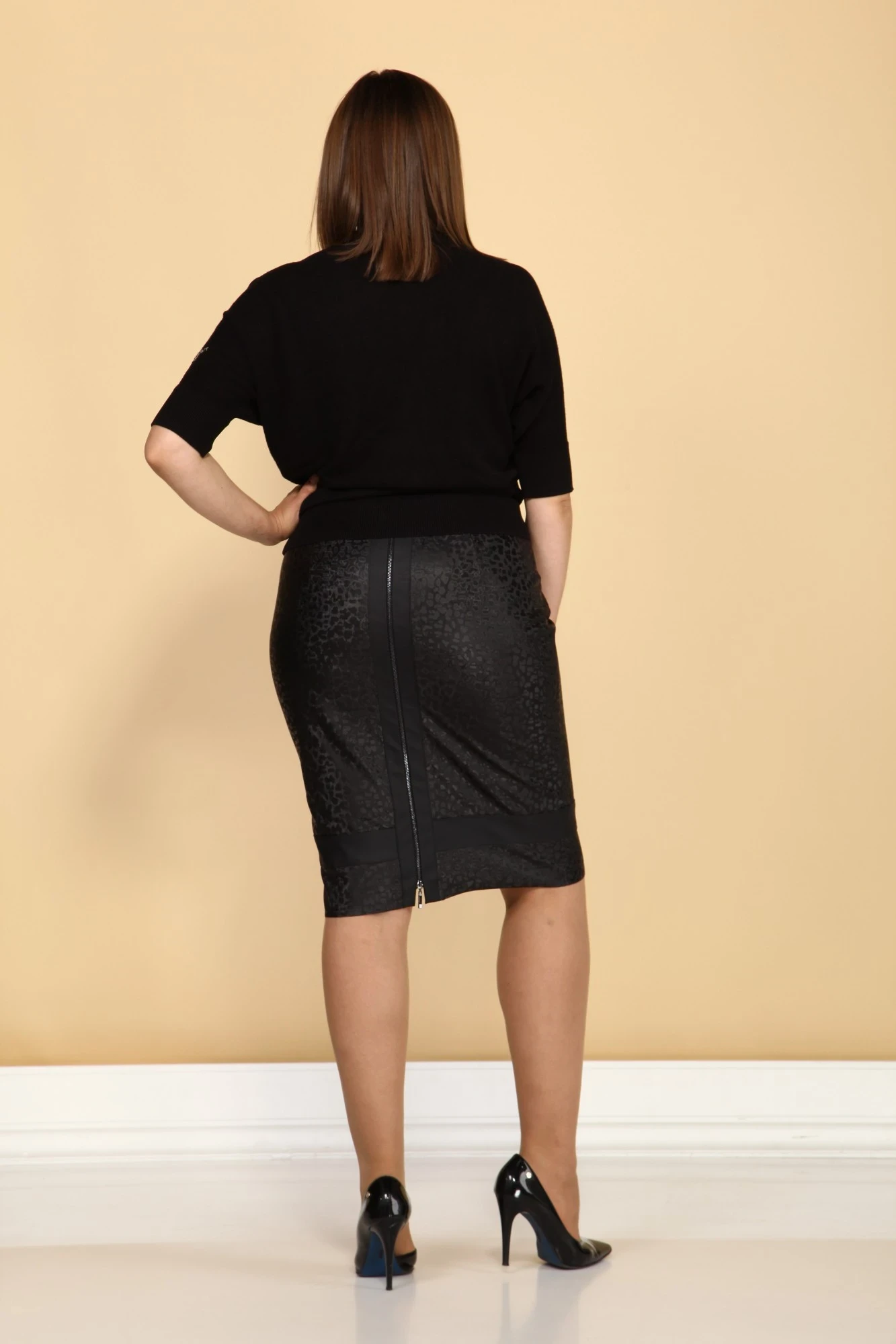 Бомбическая юбка из комбинации двух тканей, обе экокожа. Одна из них имеет рисунок леопард и она на байке.Ткань "играет" на свету. Другая ткань гладкая. По спинке по всему центральному шву вставлена металлическая молния. В левый боковой шов для большего удобства установлена застежка потайная молния. Юбка на подкладке.