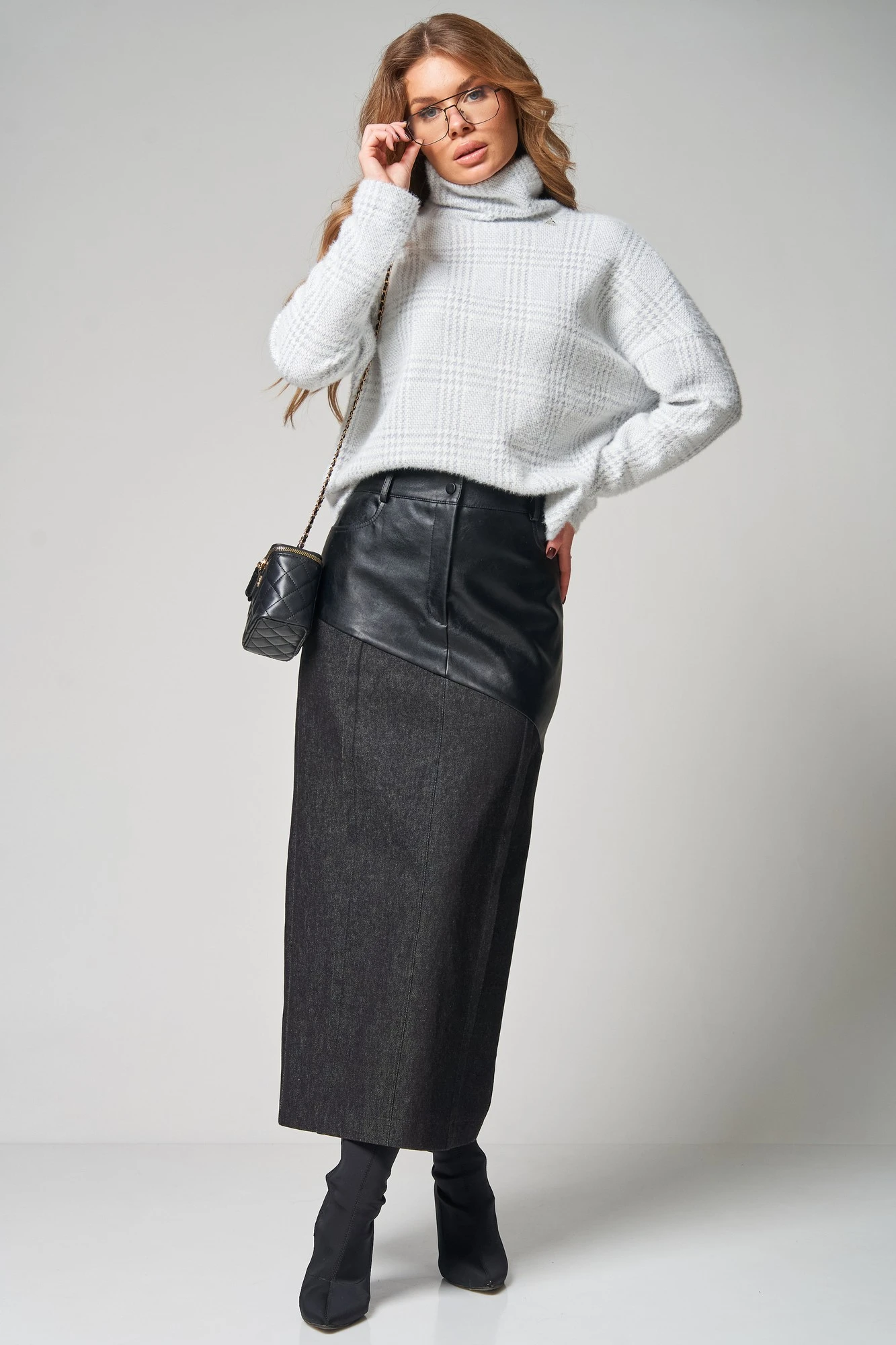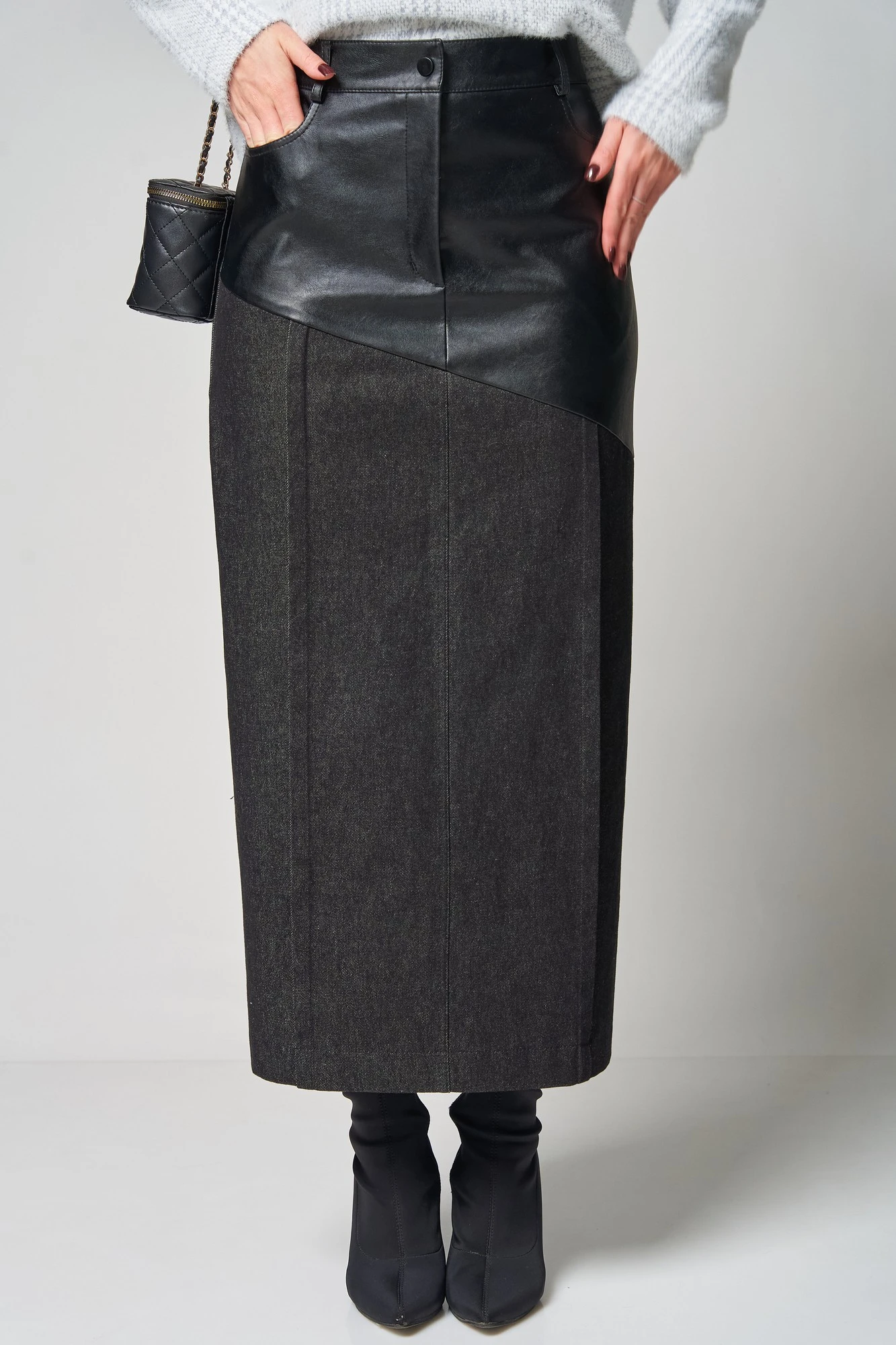 Стильная комбинированная юбка из экокожи и джинса от LAIKONY длиной «в пол».