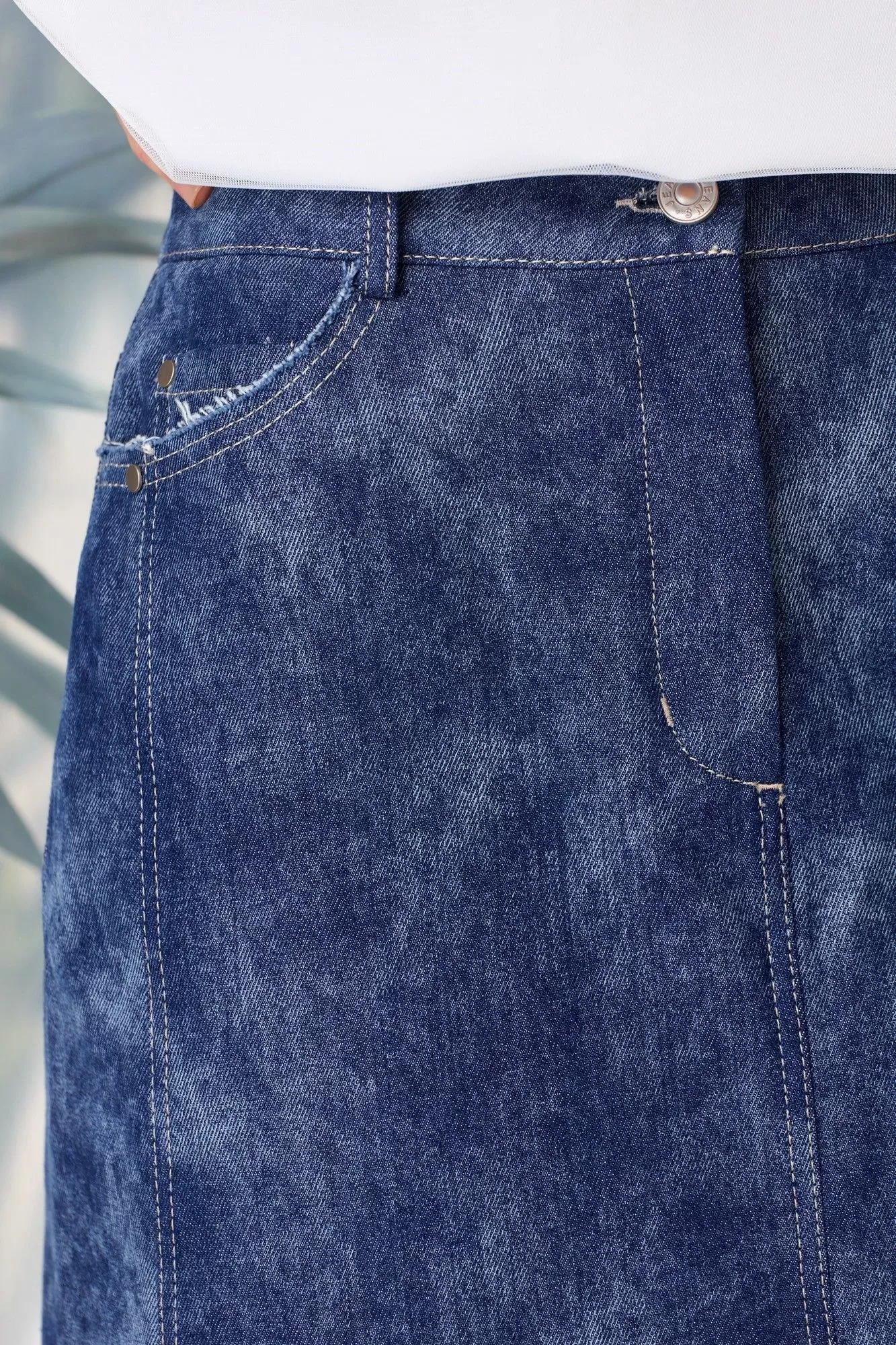 Юбка на талии, плотно облегающая вверху и расширенная к низу, длиной до середины икр, с притачным поясом. Застежка на тесьму-молнию и 1 петлю и пуговицу-«болт». Переднее полотнище юбки со средним швом, который заканчивается разрезом, с рельефными швами, в боковых швах обработаны карманы фигурной формы, на правом бочке расположен «часовой» карман. По боковым обработаны вытачки. Заднее полотнище юбки со средним швом и с кокетками, с 2-мя накладными карманами.