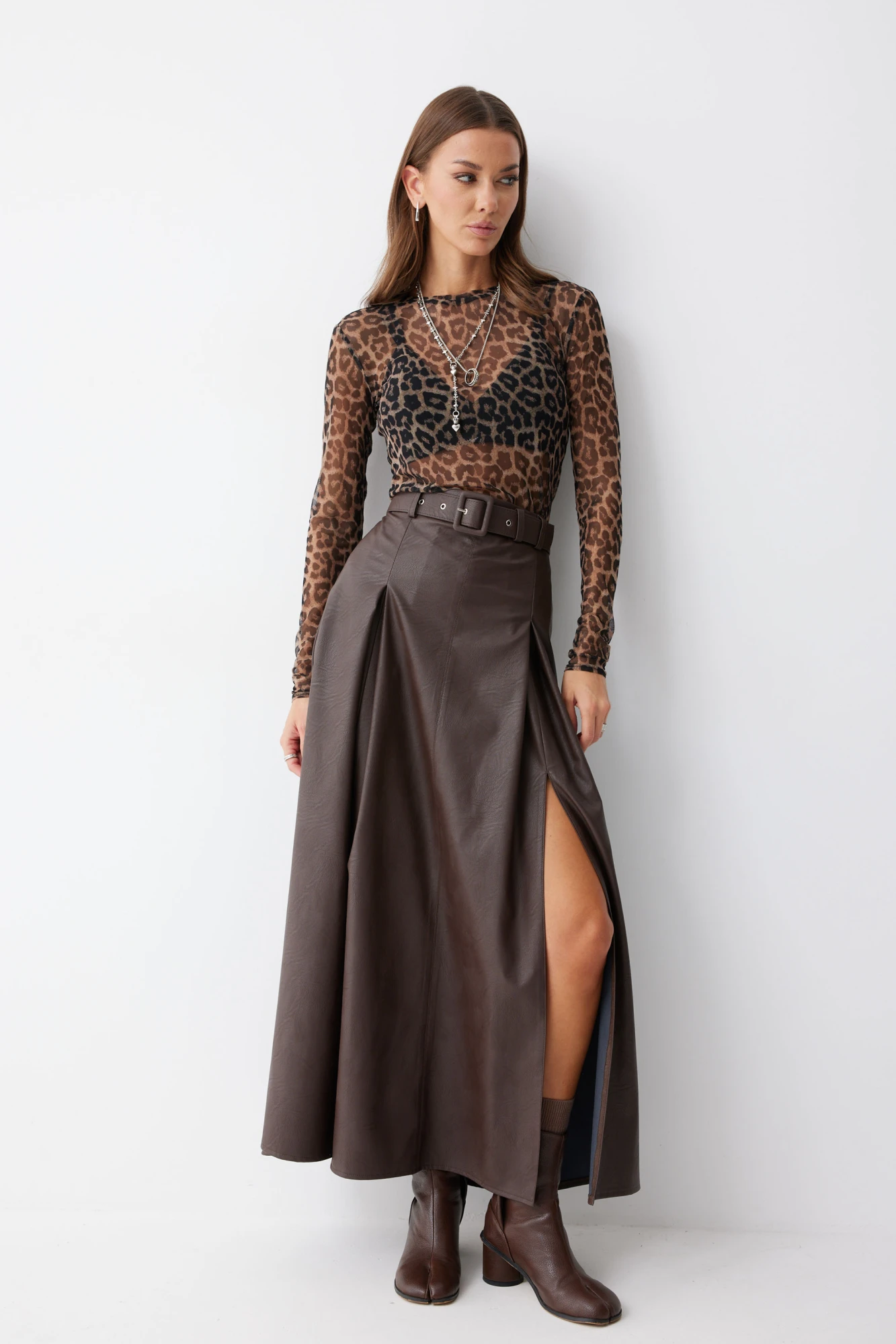 Стильная юбка А-силуэта из экокожи длины макси. По верху юбки притачной пояс со шлевками для ремня. На передних половинках расположены вытачки со встречной складкой и разрезами по низу. На задних половинках расположены талиевые вытачки. На спинке по центру потайная молния. В комплект входит ремень.