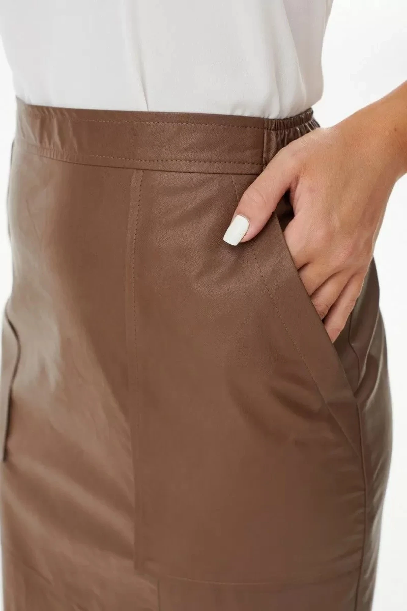 Юбка прямого силуэта из экокожи на подкладке. Спереди - горизонтальный рельеф, из рельефа по переду слева разрез. Накладные карманы с косым входом. Пояс прямой сзади на резинке. Сзади застежка - молния.